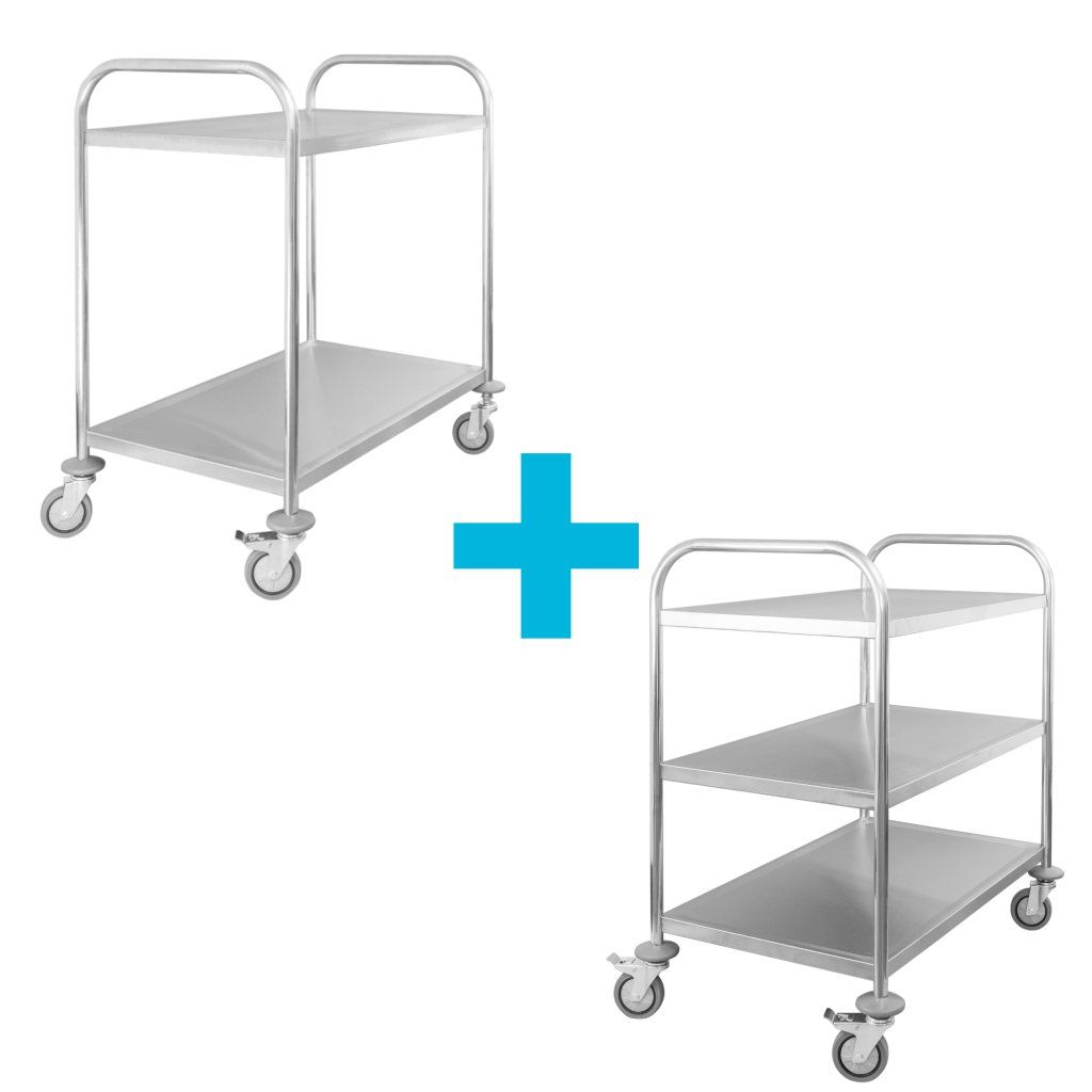 [Sada] 2policový číšnický vozík z nerezové oceli s rukojetí z kulatého profilu 860x540x940 mm + 3policový číšnický vozík z nerezové oceli s rukojetí z kulatého profilu 860x540x940 mm