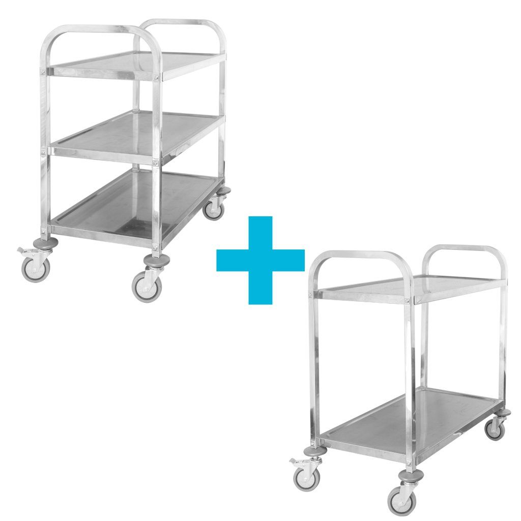 [Sada] 3-policový číšnický vozík z nerezové oceli s rukojetí ze čtvercového profilu 850x450x900 mm + 2-policový číšnický vozík z nerezové oceli s rukojetí ze čtvercového profilu 850x450x900 mm
