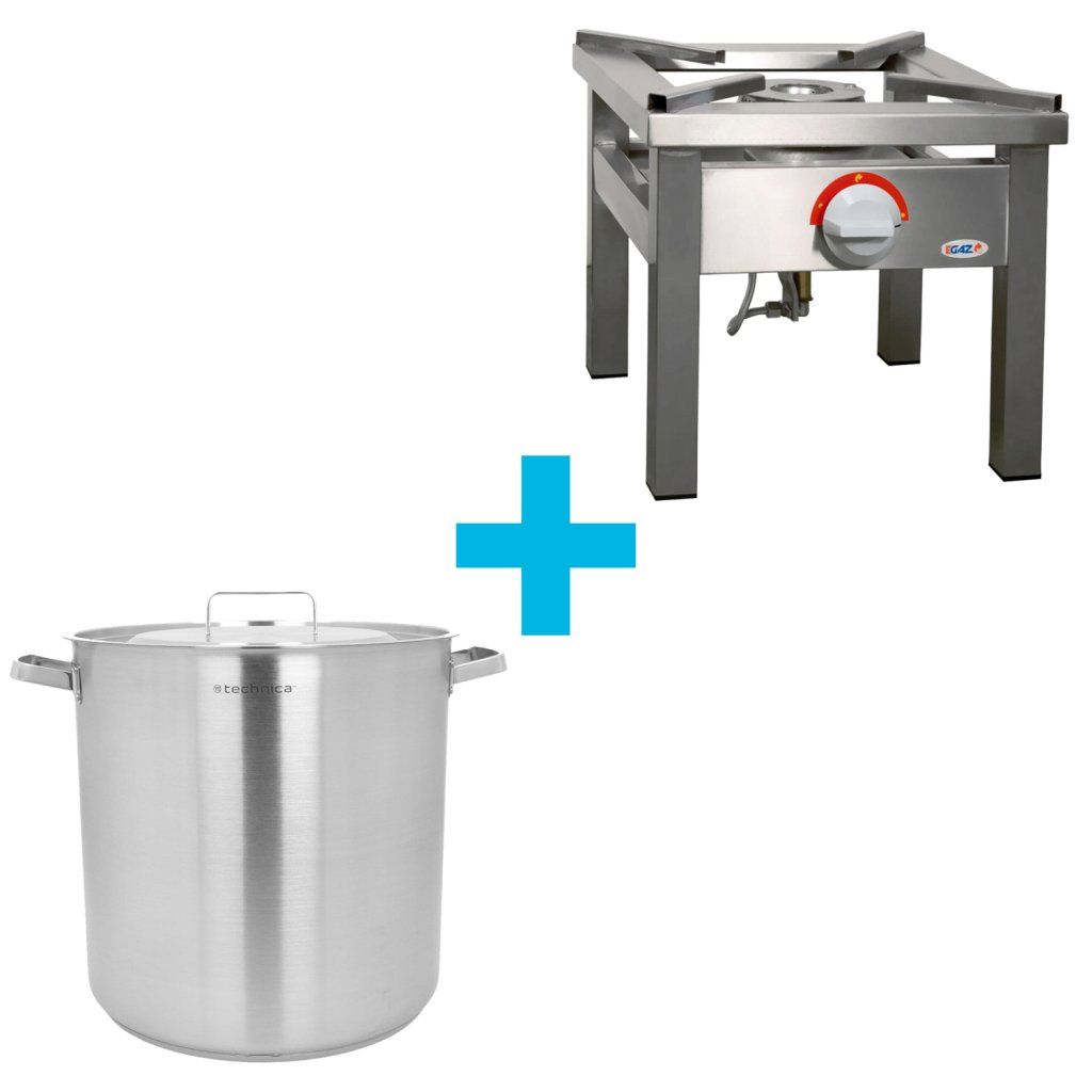 [Set] Vysoký hrnec o objemu 50,3 l a průměru 400 mm s víkem z nerezové oceli + Plynový sporák 400x400x350 mm, 6,5 kW