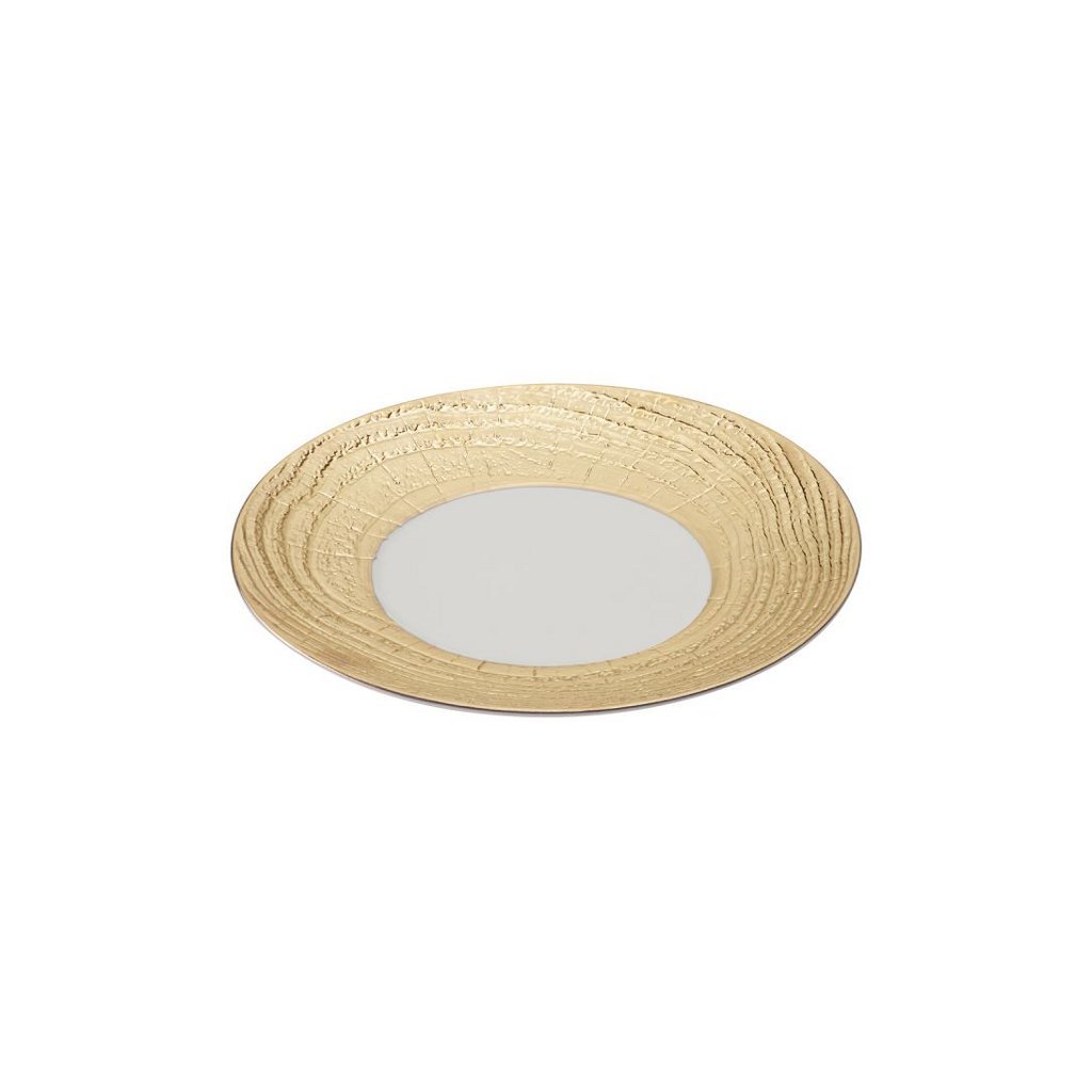 Arborescence talíř zdokonalí vaše kulinářské umění svým jedinečným designem napodobujícím kůru stromu, kterou zdobí zlato. Kromě estetické stránky vás nadchne i svou kvalitou, která odpovídá náročným požadavkům profesionálních šéfkuchařů. Je tak ideální volbou pro servírování jakýchkoliv gurmánských jídel. Kombinace slonové kosti se zlatou vám umožní hrát si s texturami a kontrasty. Jeho velká plocha pomůže vnést do vašich jídel ještě více elegance. Protože talíř zdobí zlaté prvky, neměl by být používaný v troubě nebo mikrovlnce a doporučuje se pouze ruční mytí.Talíř klubový pr. 31 cm, zlatý
