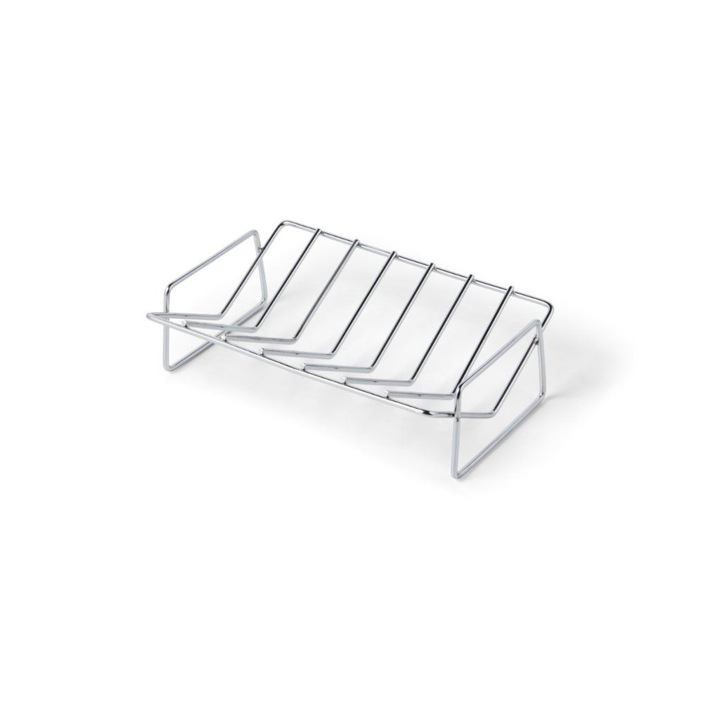 Stojan s hřbety položte na horní část grilu. Tímto způsobem se žebra, kuřecí stehna nebo kotlety rovnoměrně propečou. Stojan na žebra z nerezové oceli se snadno čistí. Doporučujeme potřít potraviny olejem na vaření, aby se zabránilo jejich přichycení ke stojanu na sparerib.