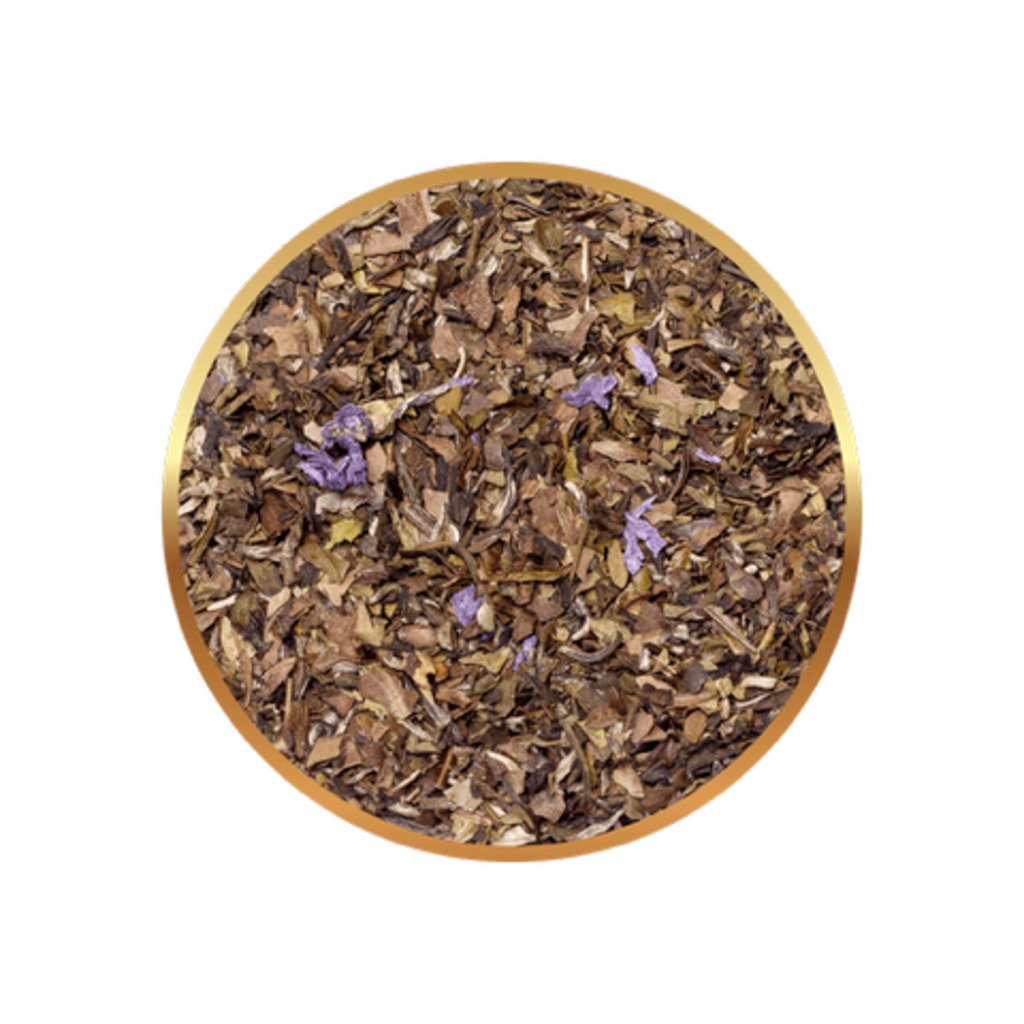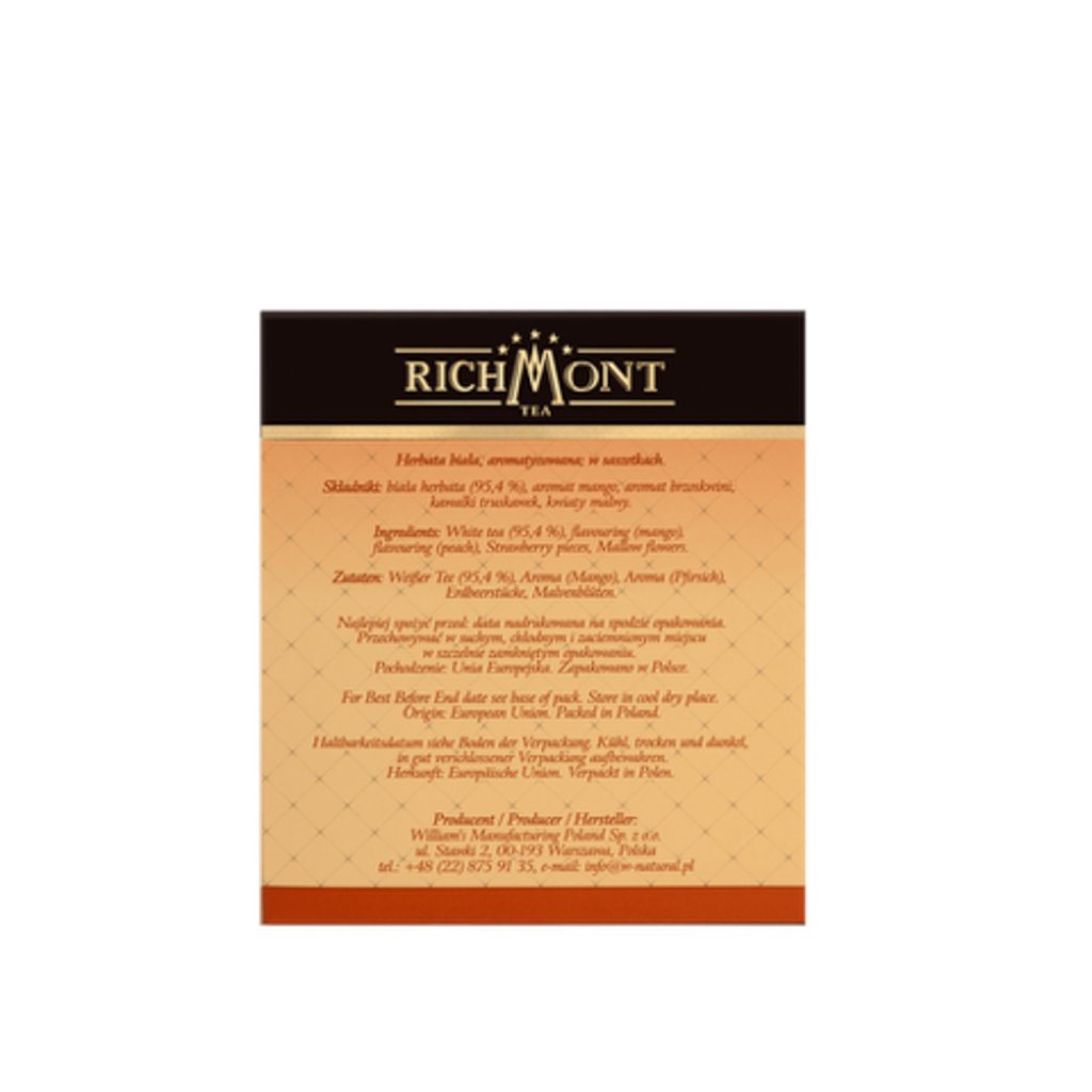Pai Mu Tan císařský čaj. Aromatické okvětní lístky. Elixír dlouhověkosti. Bílý čaj, aromatizovaný; v sáčcích.Složení: bílý čaj (95,4 %), mangové aroma, broskvové aroma, kousky jahod, květy slézu