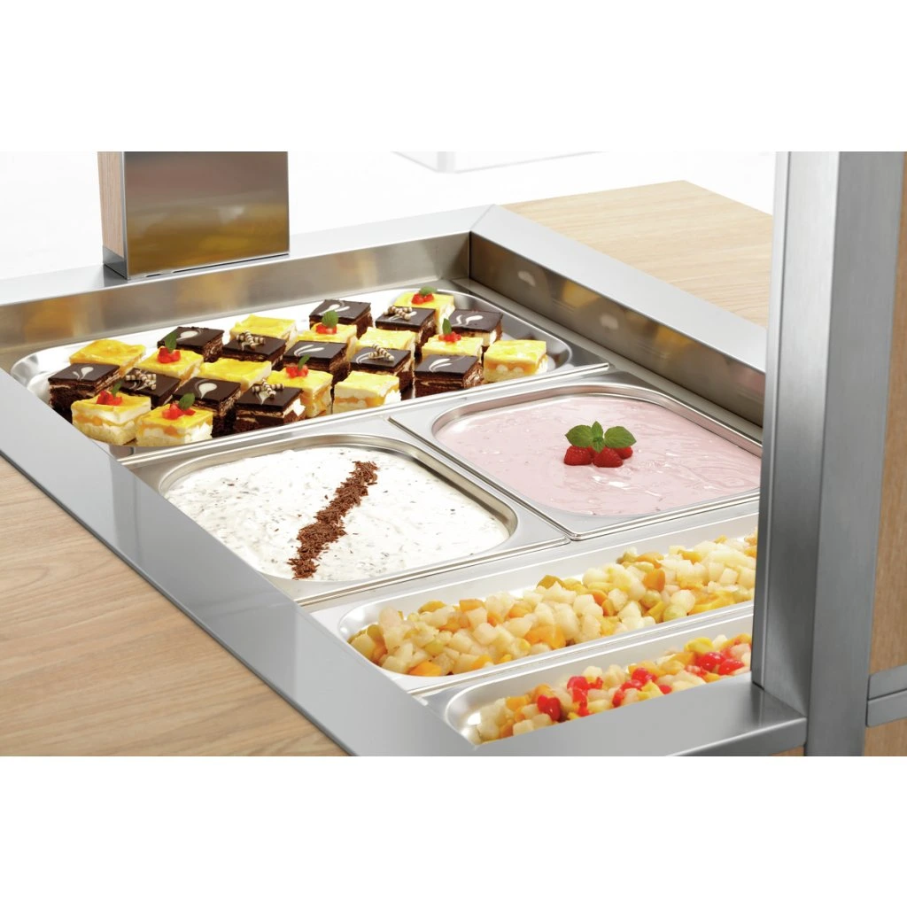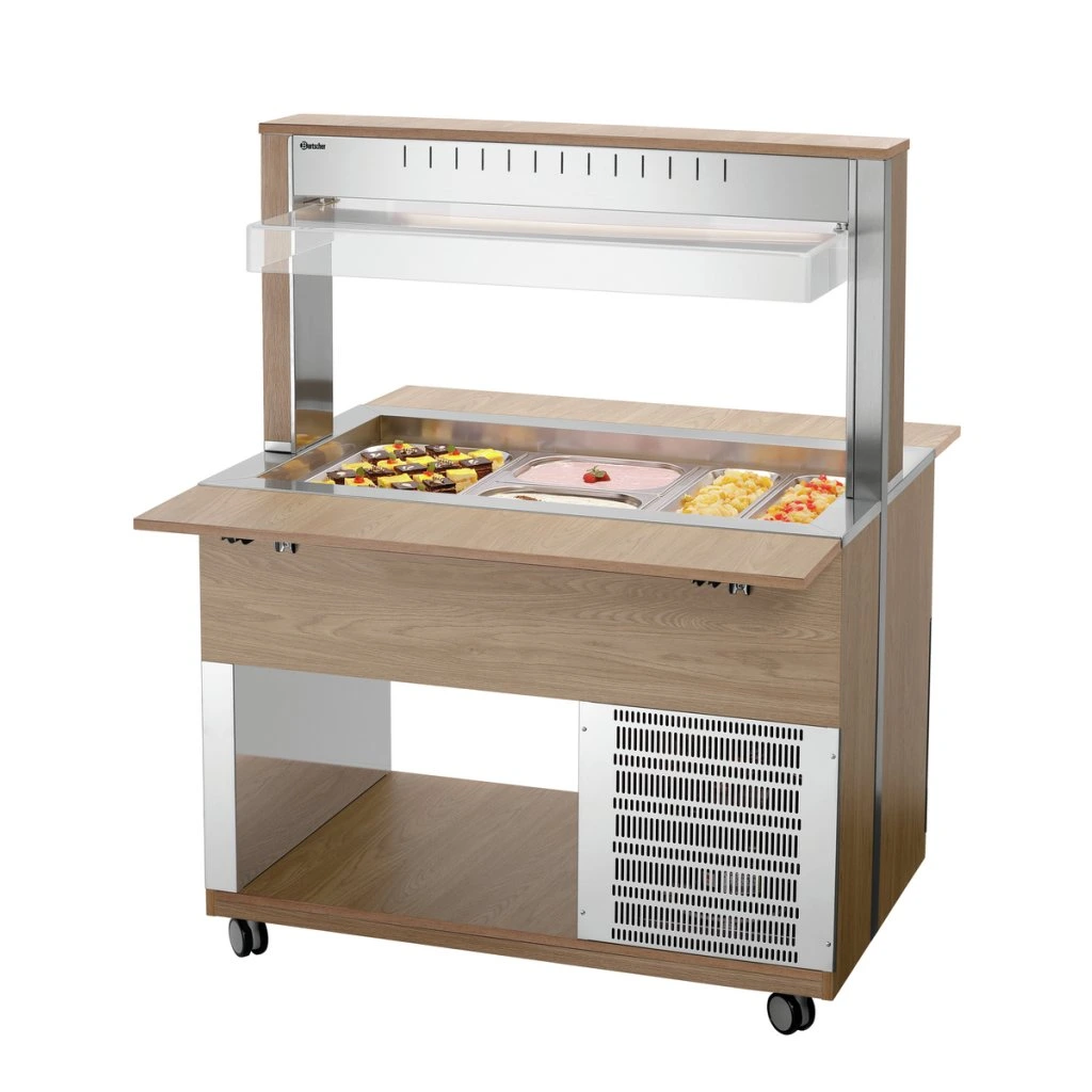 Mobilní bufetové řešení s moderním dekorem dřeva, hygienickým krytem a LED osvětlením pojme 3 nádoby GN 1/1. Díky tomu zůstanou pokrmy v bufetu optimálně vychlazené a současně atraktivně prezentované.