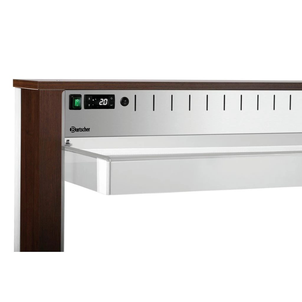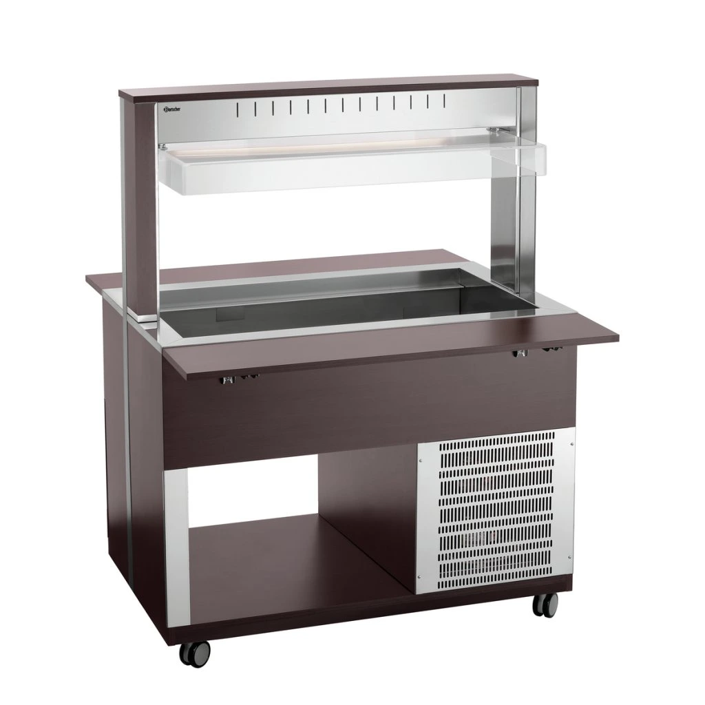 Mobilní bufetové řešení v moderním dekoru dřeva je vybaveno hygienickým krytem a LED osvětlením. Vozík pojme 3 gastronádoby 1/1 GN a pomáhá udržet servírované pokrmy dokonale chlazené při současně atraktivní prezentaci.