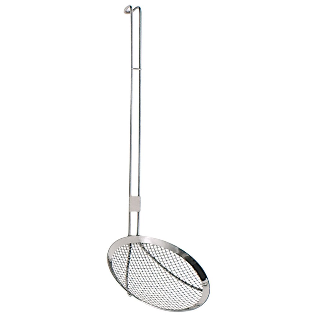 Cedník síro vyrobené z nerezové oceli. Zahnutý konec rukojeti umožňuje zavěšení příboru na věšáku nebo na okraji okapu.Doplňkové parametry