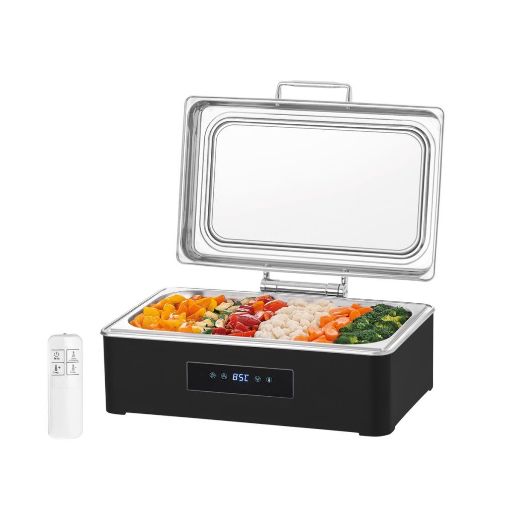 Stylový ohřívač pokrmů v elegantní černé barvě nabízí vysoký komfort i přesnou kontrolu díky intuitivnímu dotykovému ovládání a praktickému dálkovému ovladači. Skvěle se hodí do samoobslužných zón pro reprezentativní prezentaci servírovaných specialit.
