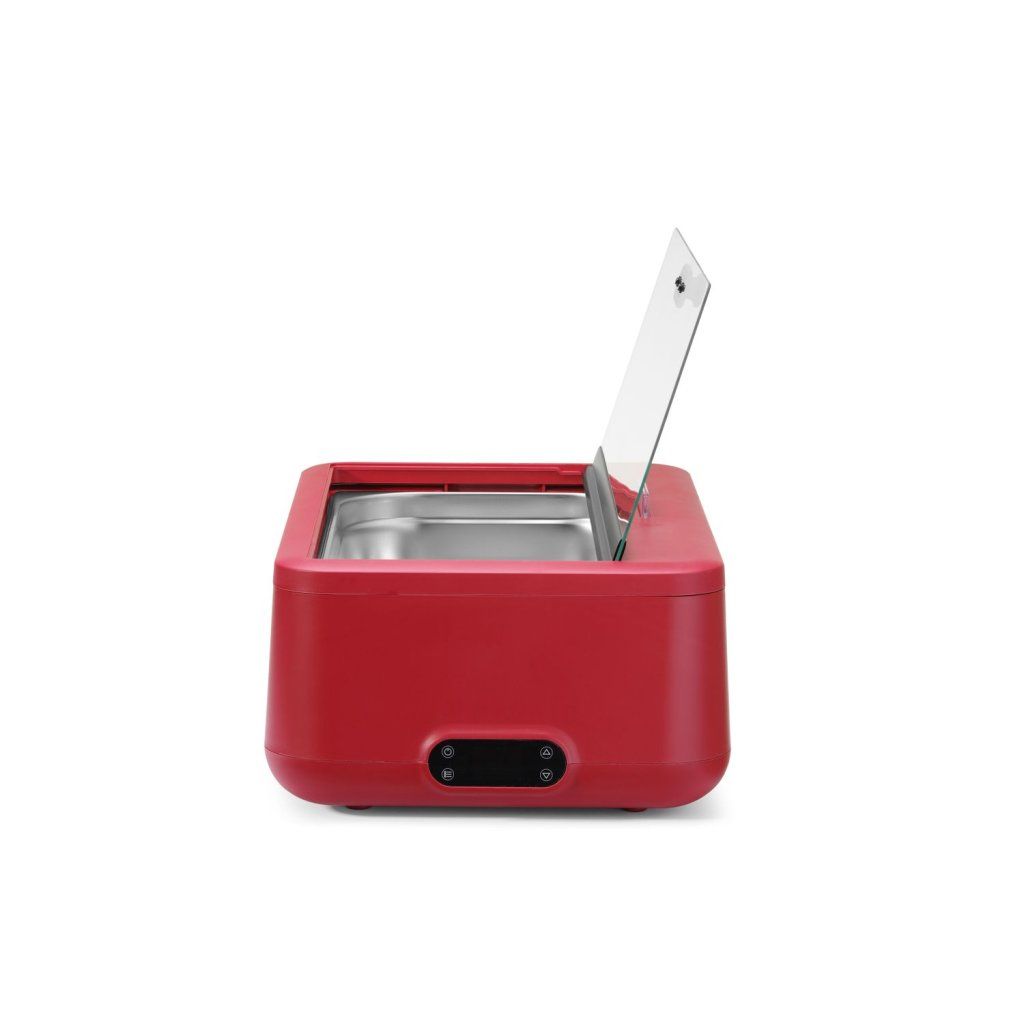 Stylový a funkční design od nizozemského designéra Roberta Bronwassera. Tělo je vyrobeno z polypropylenu odolného vůči vysokým teplotám. Vyjímatelná nádoba GN1/1 (H)100 mm z nerezové oceli 18/8, snadno se čistí. Topné těleso vyrobené z nerezové oceli 18/8 a umístěné v nádobě na vodu pro účinný přenos tepla. Víko z tvrzeného skla s izolovanou rukojetí a hliníkovým závěsem. Integrovaný držák karet na víku pro jmenovky výrobků. Digitální ovládací panel s displejem pro zobrazení pracovního času, nastavené teploty a aktuální teploty. Poslední nastavení teploty se uloží do paměti a zvolí se při každém zapnutí. Teplotu lze nastavit od 35 do 85˚C v krocích po 1˚C. Nádoba na vodu má vyraženou čáru maximálního naplnění, která udává ≈4 l. Není určena k vaření, pouze k udržování tepla.Buďte první, kdo napíše příspěvek k této položce.