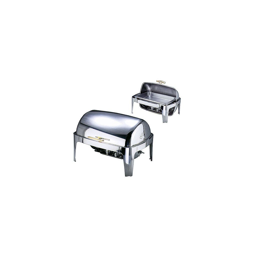 Chafing roll-top z leštěné nerezové oceli s pozlacenými úchyty a víkem. Možnost otevíraní pod úhlem 90° a 180°. Součást gastronádoba GN 1/1 hluboká 65 mm a dvě nádoby na pastu.Doplňkové parametry