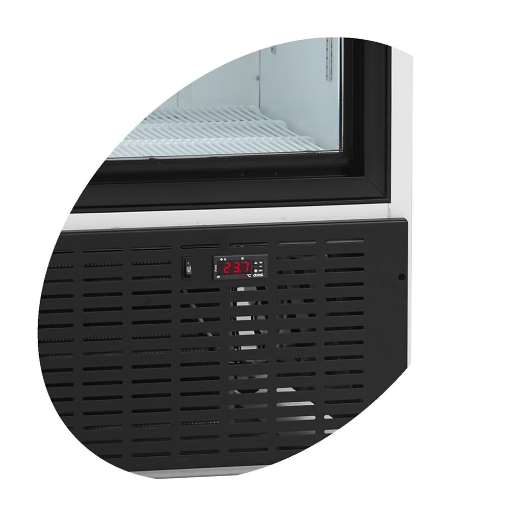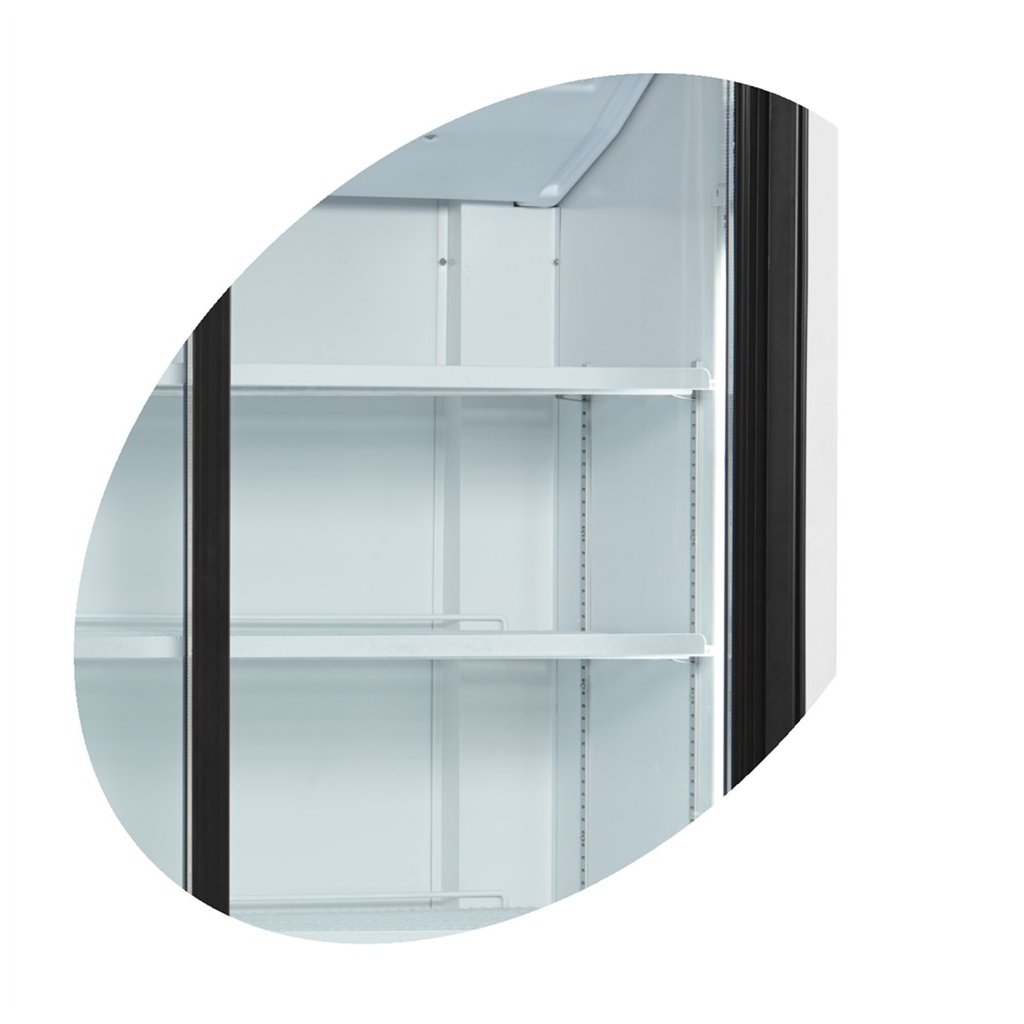 Chladicí skříň se dvěma prosklenými posuvnými dveřmi. Řada FS je bez světelné nástavby pro reklamu. Poskytuje trochu větší vnitřní výšku a přispívá k čistšímu vzhledu skříně. Jedná se o univerzální chlaicí prosklenou skříň, která je vhodná pro prodej nápojů, mléčných výrobků (mléko, sýry atd.), sendvičů, ideálně se tak hodí do velkých supermarketů i do menších obchodů, kaváren i čerpacích stanic. Tento model má bílý exteriér i interiér a dodává se s 5 nastavitelnými bílými roštovými policemi a 2 samozavíracími posuvnými prosklenými dveřmi.Doplňkové parametry