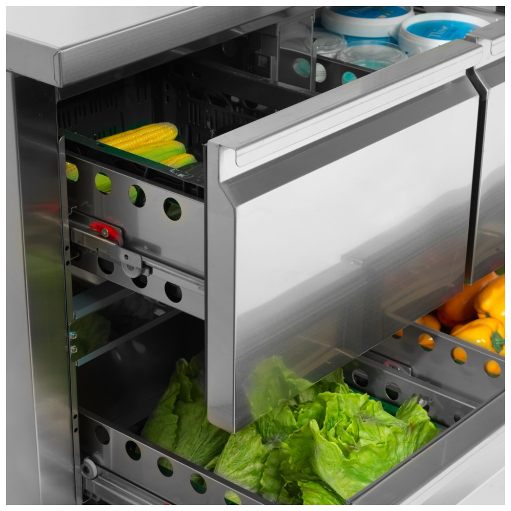 Chladicí stůl z nerezové oceli se zásuvkami a policemi GN1/1Nový CK7410X1 je energeticky úsporný chladicí stůl pro profesionální prostředí. Má o 54 % nižší spotřebu energie ve srovnání s předchozím modelem CK7410/-SP.Chladicí stůl CK je určen pro profesionální kuchyně a představuje ideální řešení, jak udržet suroviny v chladu a na dosah během podávání. Je vyroben z odolné nerezové oceli SS304 a je vybaven automatickým odmrazováním a policemi s rozměry GN1/1 pro snadné čištění a hladkou práci.Jeho chladicí systém s ventilací udržuje stálou teplotu obsahu a elektronický regulátor umožňuje snadno nastavit teplotu podle vašich ingrediencí. Ovladač nabízí NFC konektivitu a funkci Bluetooth. To znamená, že pomocí aplikace můžete ovládat osvětlení, sledovat teplotu, a dokonce exportovat data pro snadné podávání zpráv. Má horní panel, který lze odstranit, pokud jej chcete používat jako chladicí box pod pultem a přidat vlastní desku pultu. Nohy jsou nastavitelné, takže je možné přizpůsobit výšku stolu vašim potřebám. Chladicí stůl CK je vynikajícím doplňkem každé profesionální kuchyně.Doplňkové parametry