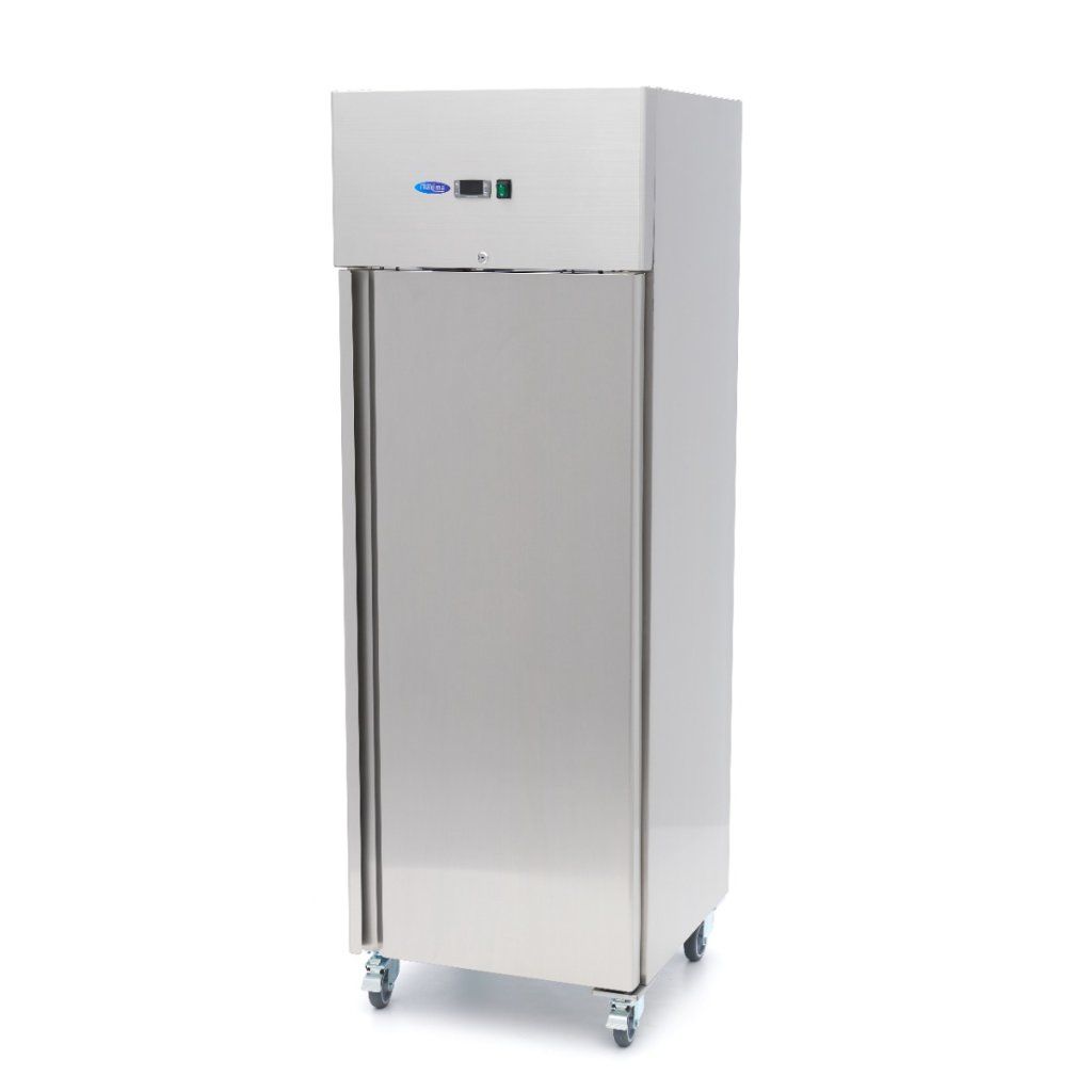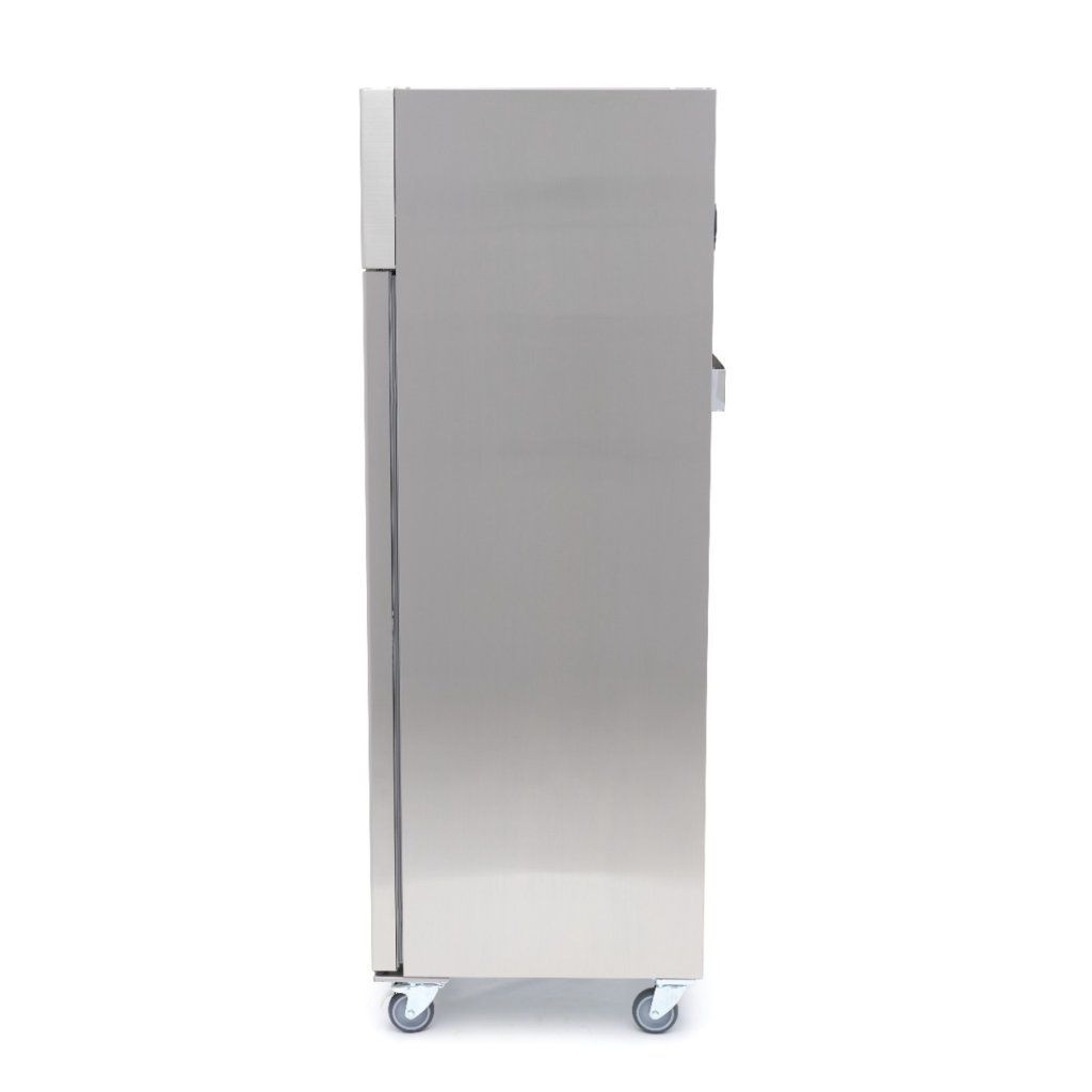 Tato chladnička je vybavena třemi robustními nastavitelnými policemi (55 x 53 cm), které jsou ideální pro uložení nejrůznějších surovin. Součástí samozavíracích dveří je antibakteriální gumové těsnění a zámek se dvěma klíči pro větší bezpečnost. Zaoblené vnitřní rohy zabraňují hromadění nečistot, takže údržba hygieny je snadná. Jednotka je namontována na čtyřech kolečkách, z toho dvou s brzdou, takže se snadno přemisťuje a je bezpečná, když je na svém místě. LED osvětlení zajišťuje jasný přehled o obsahu, jakmile se otevřou dveře.