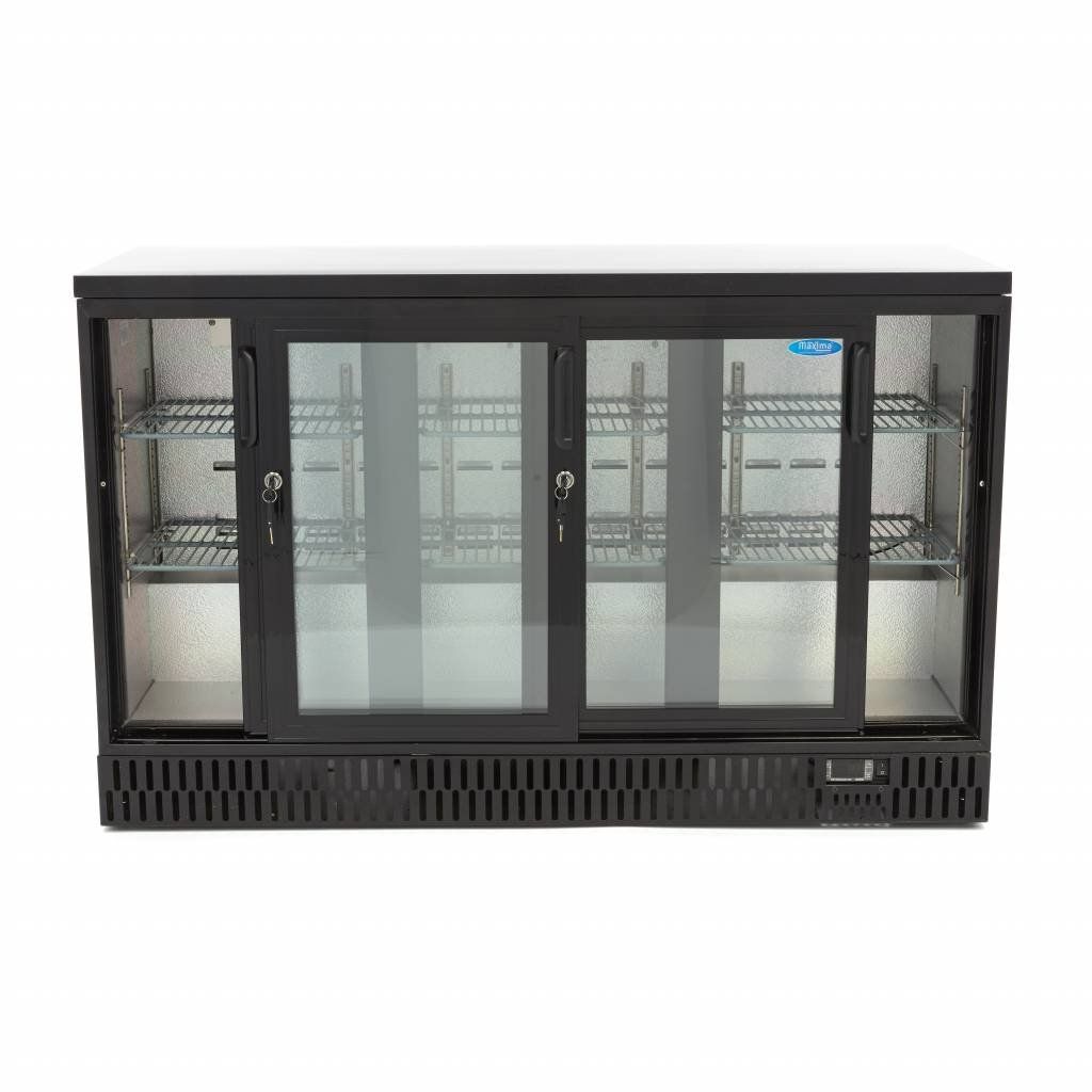 Chcete-li profesionálně prezentovat nápoje a občerstvení a zároveň je udržet chlazené, potřebujete tuto luxusně zpracovanou černou chladničku na nápoje. Má objem 323 l a je vybavena třemi posuvnými dveřmi pro snadný přístup. Ty jsou opatřeny dvojitým sklem, aby výrobky zůstaly dokonale vychlazené, dokud nebudou potřeba. Všechny dveře jsou opatřeny zámkem pro úplné uzavření chladničky. Za každými dveřmi jsou dvě nastavitelné police, takže si můžete přizpůsobit uspořádání podle svých potřeb. Pro ještě lepší prezentaci výrobků v chladničce na nápoje má vestavěné LED osvětlení.