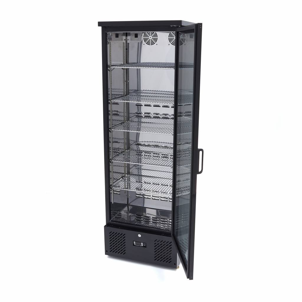 Tato elegantní černá chladnička na nápoje je ideální pro stravovací zařízení s omezeným prostorem. Jedná se o vysoký model s jedněmi výklopnými dveřmi, který umožňuje skladovat spoustu produktů ve vertikální poloze, čímž šetří cenné místo a zároveň udržuje vše dokonale vychlazené, dokud není potřeba. Tyto chlazené produkty jsou potenciálním zákazníkům prezentovány atraktivně a profesionálně díky zabudovanému LED osvětlení. Dveře jsou vybaveny zámkem a dvěma klíči, které zajišťují jejich bezpečnost, a protože je chladnička na kolečkách, lze ji snadno přemisťovat. Uvnitř se nachází pět polic z nerezové oceli, z nichž každou lze výškově nastavit pro optimální uspořádání.