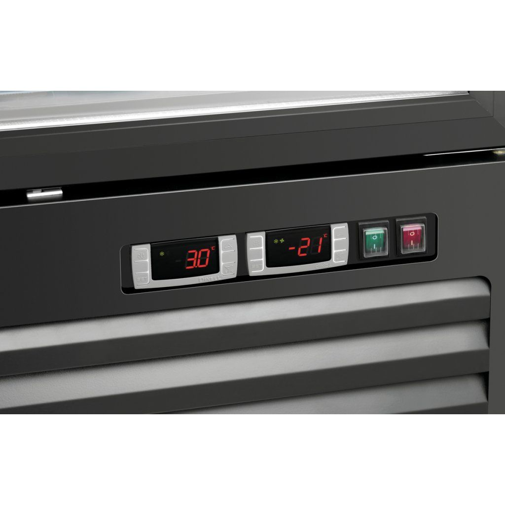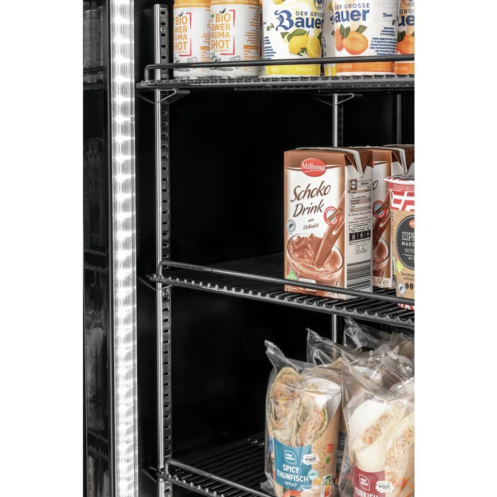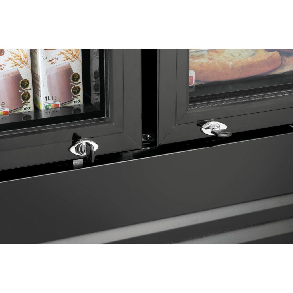 Kombinace chladničky a mrazničky v elegantním černém designu nabízí celkový objem 820 litrů. Skleněné dveře umožňují rychlý přehled o uložených potravinách a samostatně spínatelné LED osvětlení pomáhá zajistit atraktivní prezentaci obsahu.