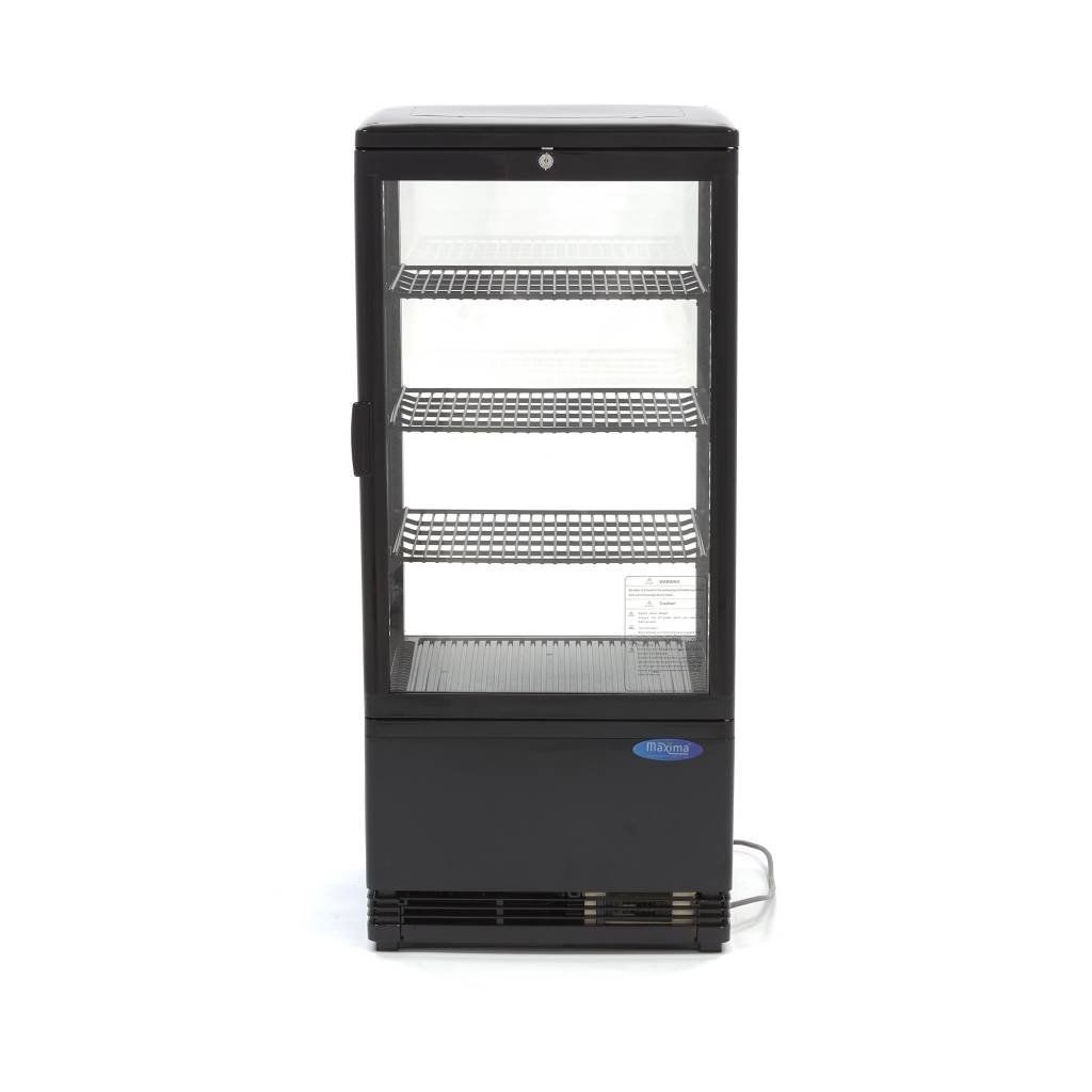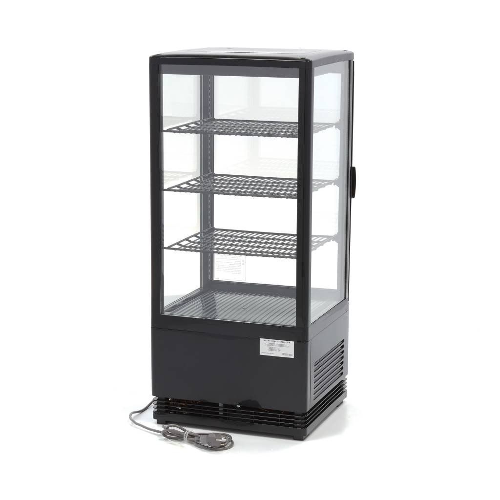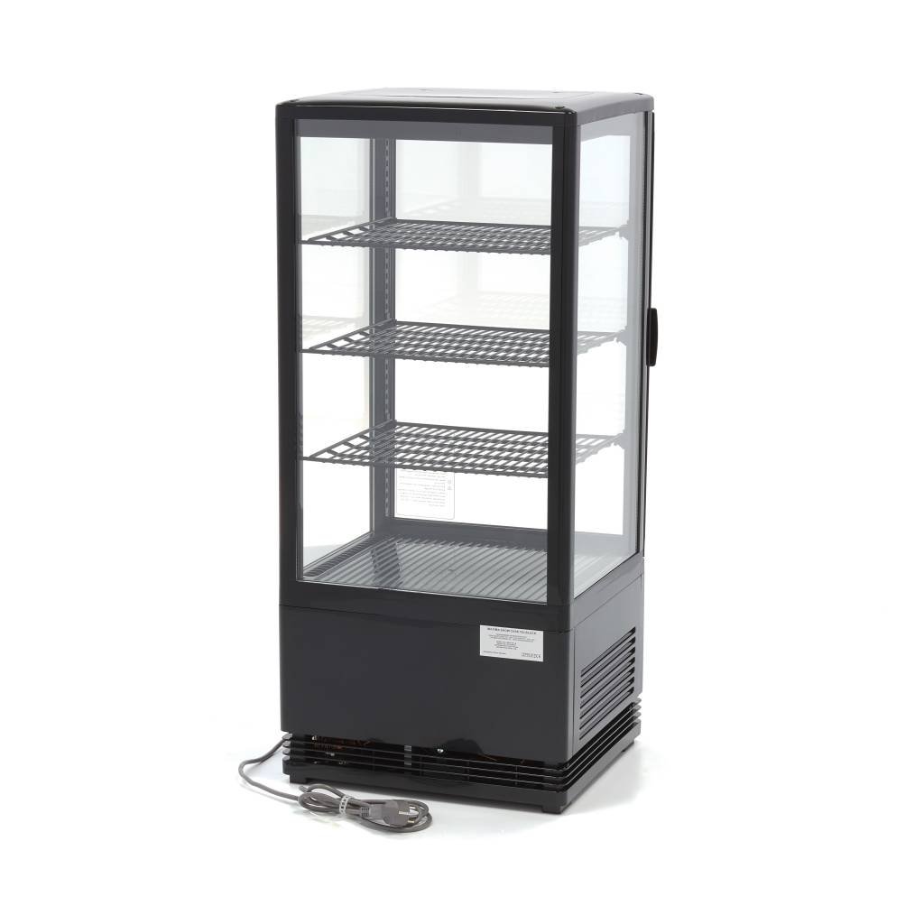 Díky objemu 78 litrů a třem dodávaným policím má tato robustní chladicí vitrína dostatek prostoru pro chlazení a prezentaci široké škály výrobků, jako jsou sendviče, nápoje, saláty a mléčné výrobky. Chladicí vitrína je nejen velmi praktická, ale díky čtyřem skleněným oknům a zabudovanému LED osvětlení je také ideální pro prezentaci výrobků. Je velmi vhodná pro pekárny nebo gastronomické provozy, aby zákazníkům ukázala nabízené výrobky. Další výhodou mini chladicí vitríny je, že má pevné nohy a obsahuje zámek se dvěma klíči.