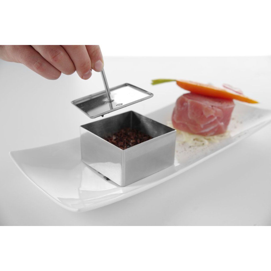 Kuchařsko-cukrářská obruč vyrobená z nerezové oceli 18/0 je vhodná pro tvarování těsta a potravin. Vhodná do myčky. Foto je pouze ilustrační, přitlačný poklop je potřeba objednat zvlášť.Doplňkové parametry