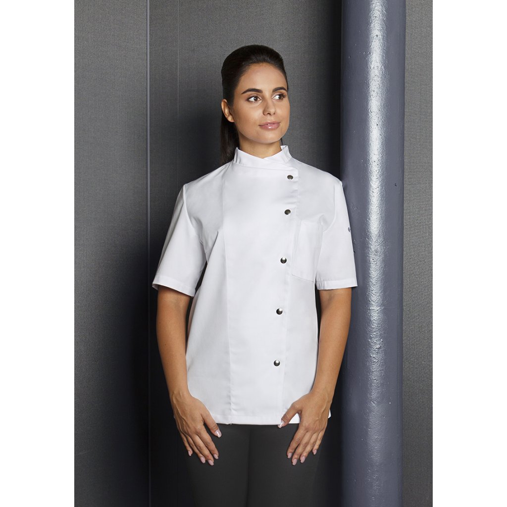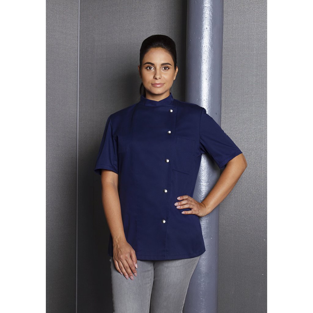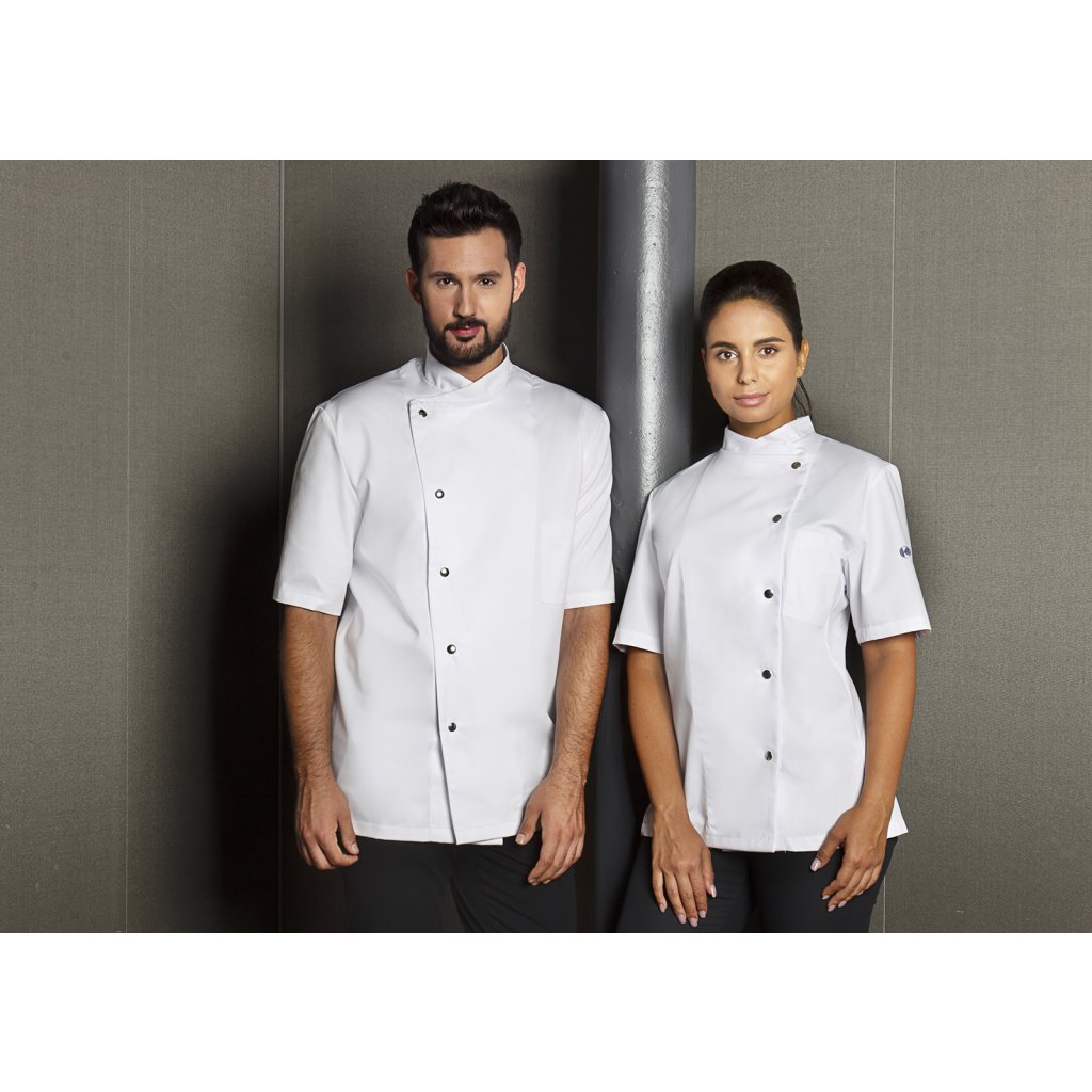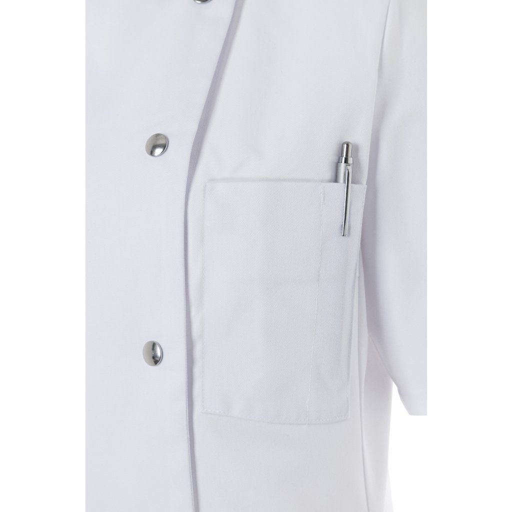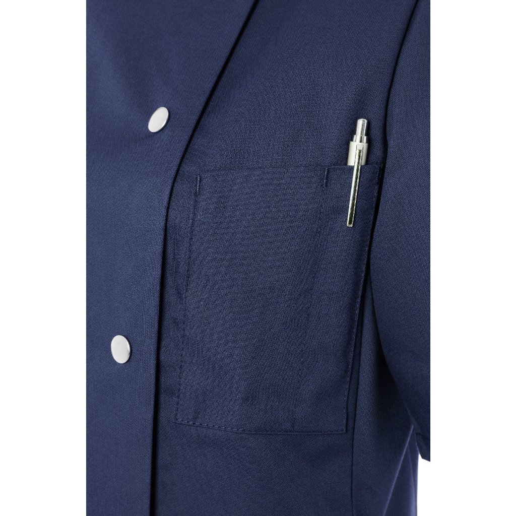 | keprová vazba, 65 % polyester / 35 % bavlna, 215 g/m² | vysoce kvalitní, předsrážená, stálobarevná, snadno se udržuje | | kuchařská bunda pro dámy s krátkými rukávy a přiléhavým střihem | prsní záševky, boční švy vpředu a vzadu | našitá, šikmá náprsní kapsa na levé straně (min. 7 x 13 cm) s kapsou na pero (2 x 13 cm) | sako s 5 knoflíky a druky | vhodná pro průmyslové praní | odpovídající výrobek: Kuchařská bunda Gustav - JM 15 (číslo výrobku výrobce)Doplňkové parametry