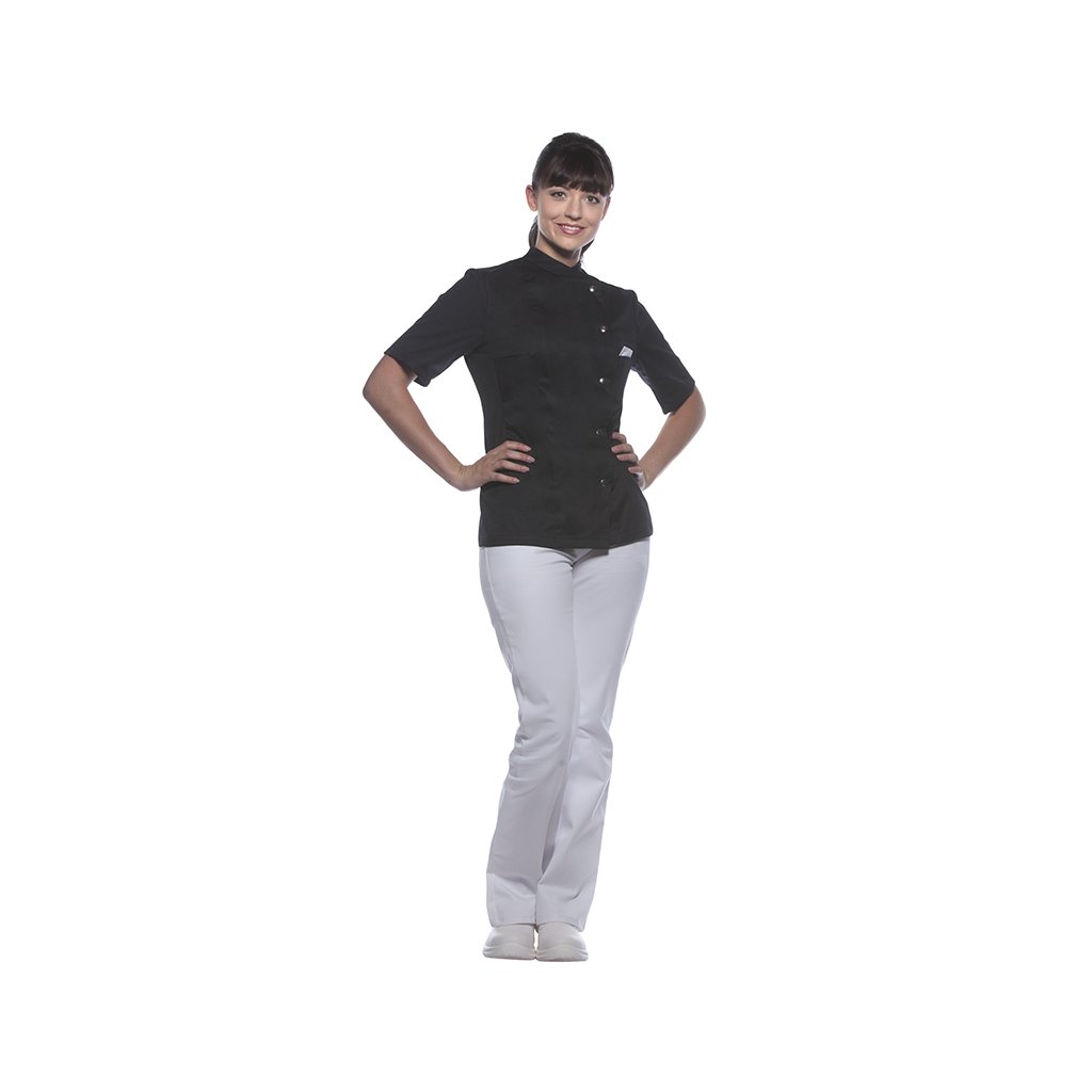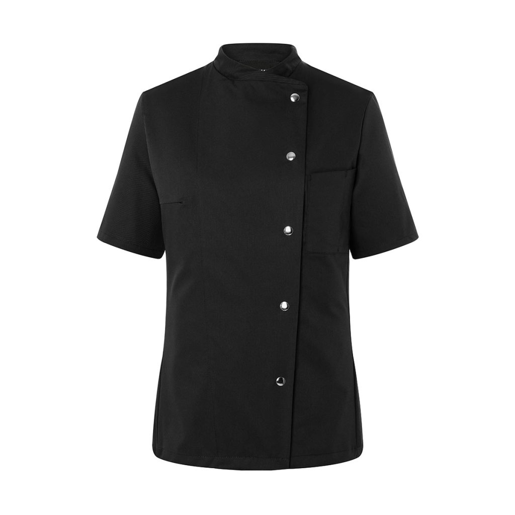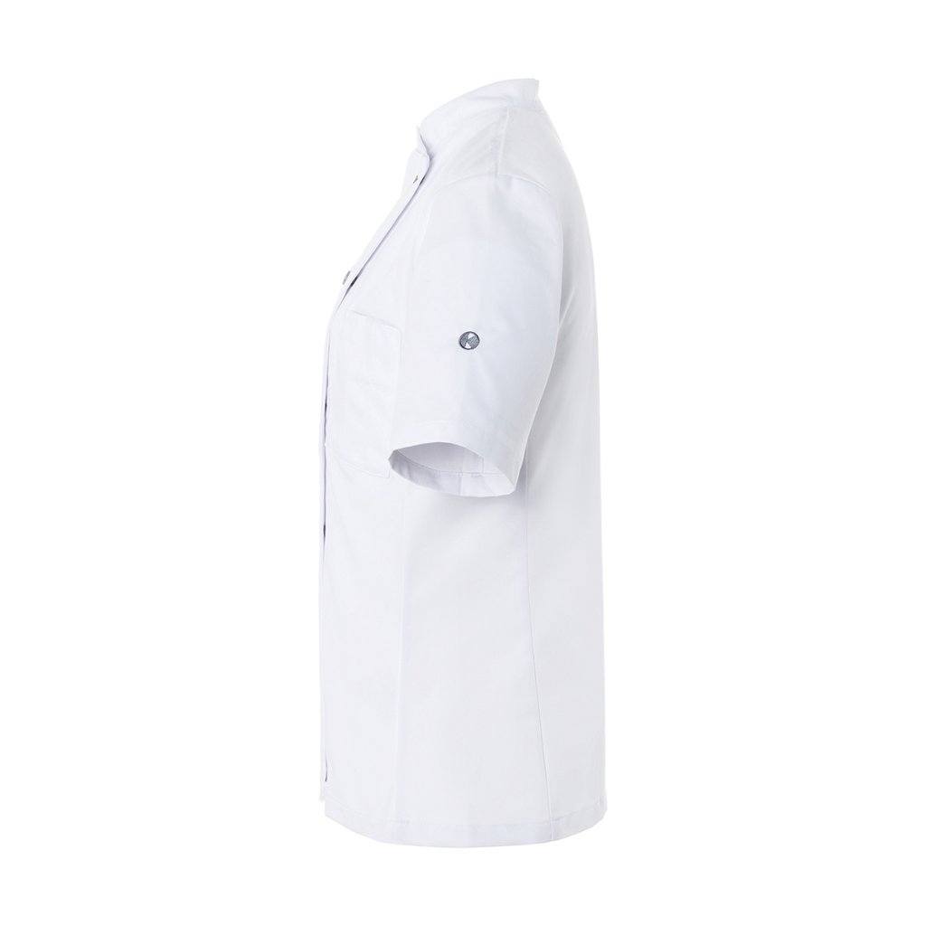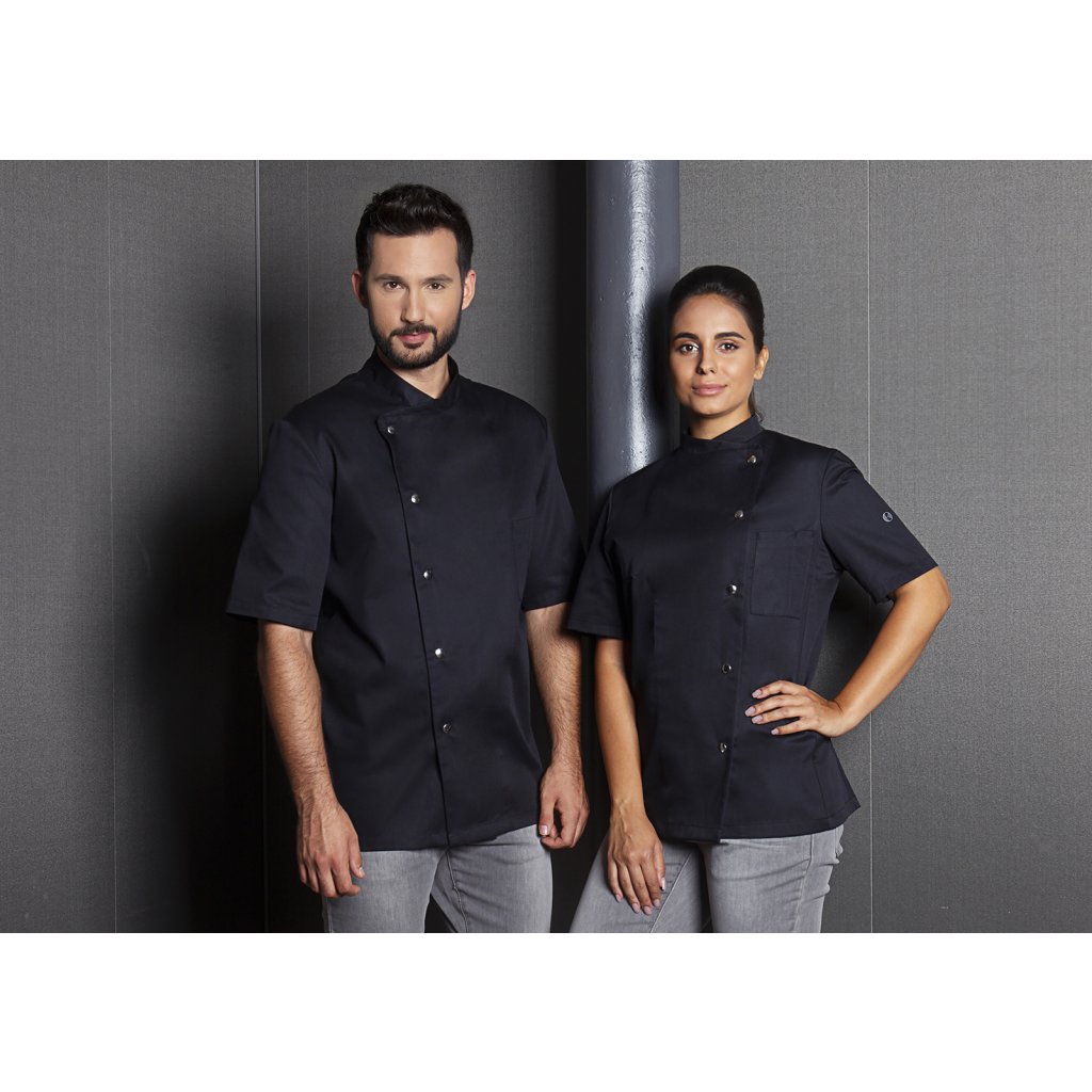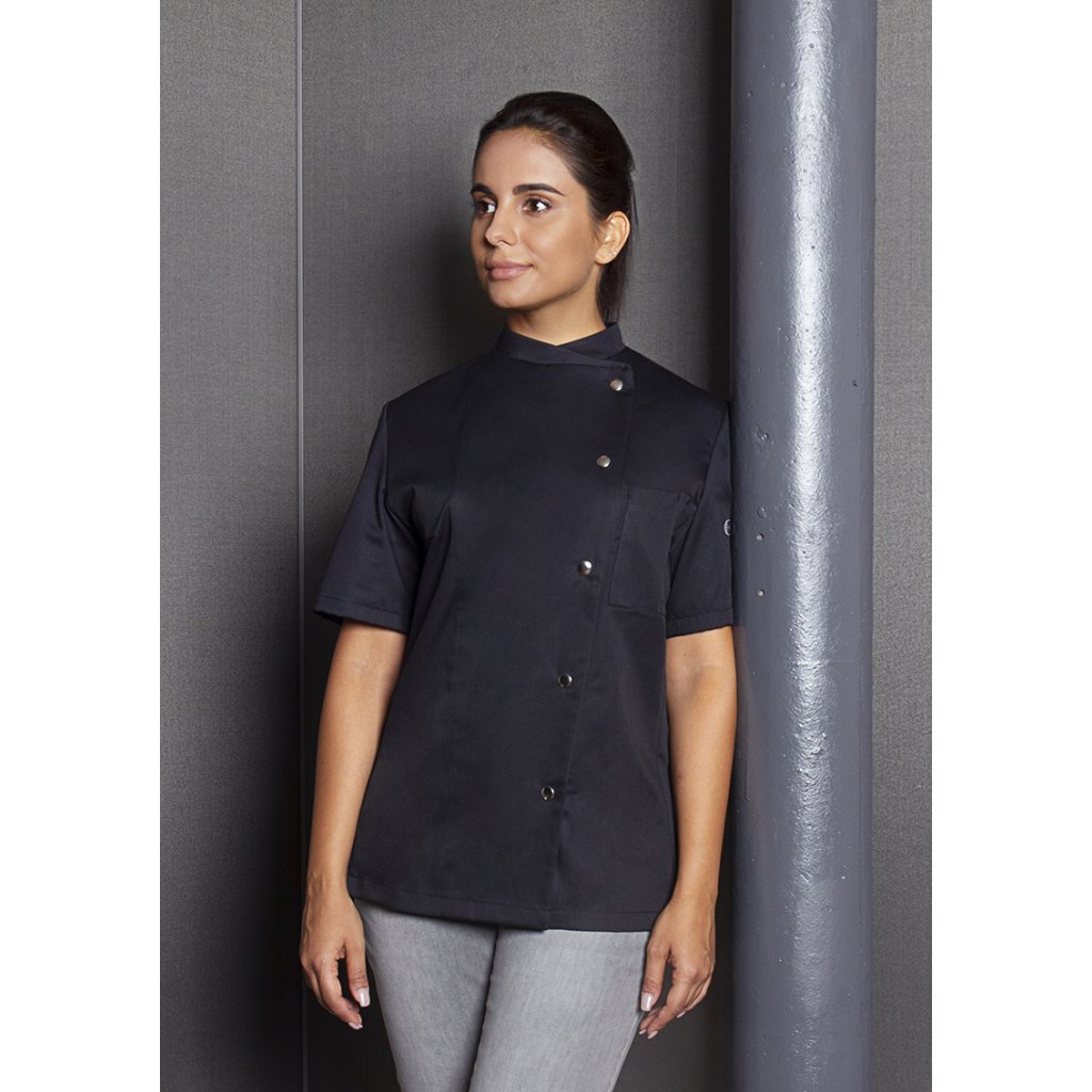 | keprová vazba, 65 % polyester / 35 % bavlna, 215 g/m² | vysoce kvalitní, předsrážená, stálobarevná, snadno se udržuje | | kuchařská bunda pro dámy s krátkými rukávy a přiléhavým střihem | prsní záševky, boční švy vpředu a vzadu | našitá, šikmá náprsní kapsa na levé straně (min. 7 x 13 cm) s kapsou na pero (2 x 13 cm) | sako s 5 knoflíky a druky | vhodná pro průmyslové praní | odpovídající výrobek: Kuchařská bunda Gustav - JM 15 (číslo výrobku výrobce)Doplňkové parametry