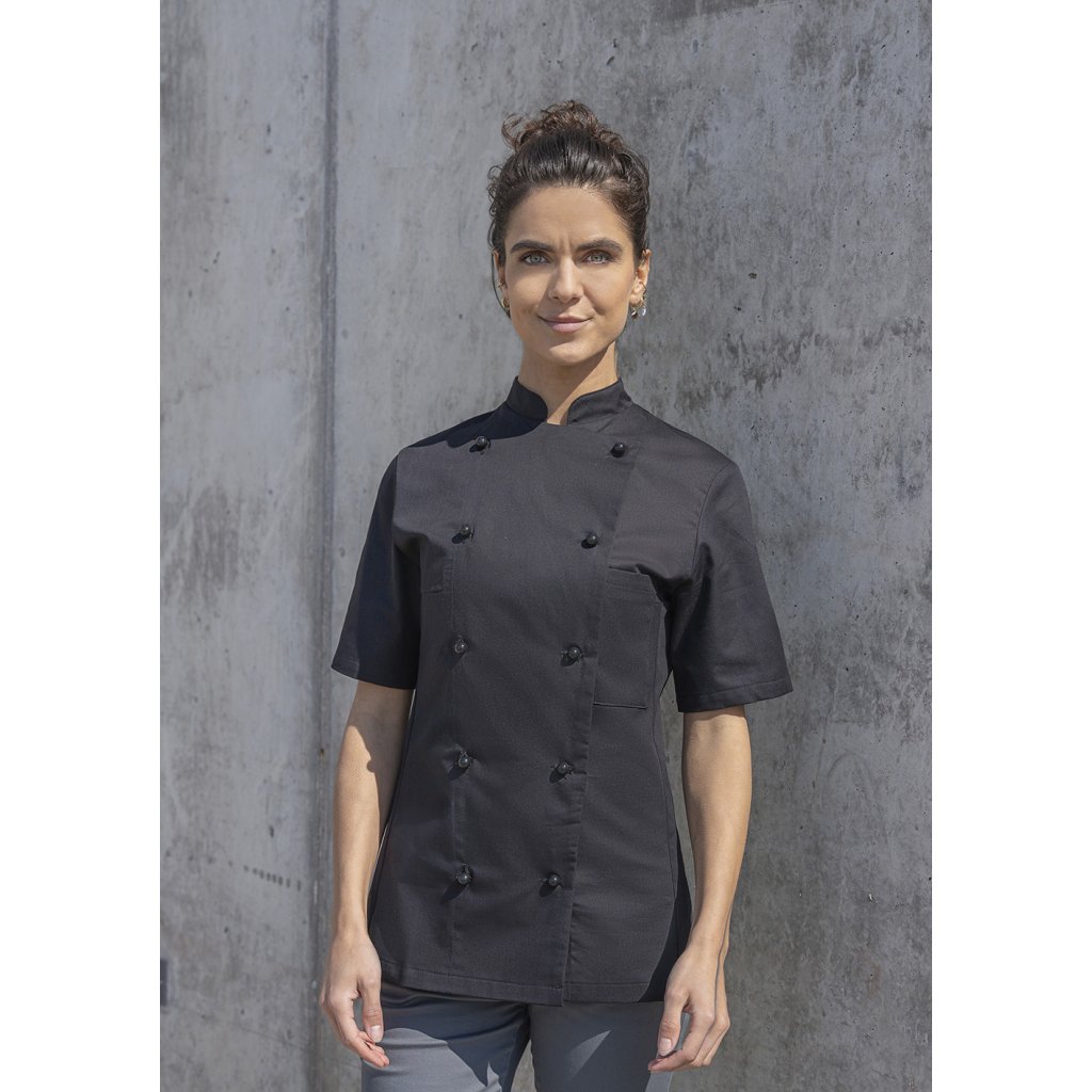 | keprová vazba, 100 % bavlna, 210 g/m² | vysoce kvalitní, předsrážená, stálobarevná | klasická dámská kuchařská bunda s krátkými rukávy | klasická dámská kuchařská bunda s krátkými rukávy | přiléhavý střih a záševky v oblasti prsou | našitá náprsní kapsa na levé straně (8 x 13 cm) | dvouřadá bunda s 10 knoflíky (bez knoflíků a knoflíkové légy; tyto je nutné objednat samostatně) | vhodná pro průmyslové praní pro snadnou údržbu a dlouhou životnost | odpovídající knoflíková léga: KL 1 (číslo výrobce) | odpovídající výrobek: Kuchařská bunda Lennert - JM 20 (číslo výrobku)Doplňkové parametry