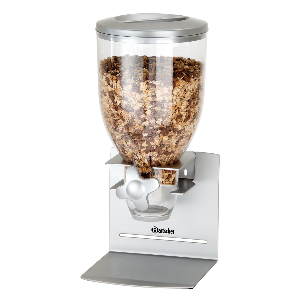 Dávkovač na cereálie:- stříbrný rám, lakovaný ocelový plech,- obal: plast odolný proti poškrábání,- objem: 3,5 litru,- Dávkování otáčením knoflíku, žádné drcení,- vhodné pro misky do výšky 7,5 cm- snadná demontáž pro čištění,- Rozměry: Š 180 x H 170 x V 395 mm,- Lze namontovat na stěnu (upevňovací materiál není součástí balení),- hmotnost: 1,8 kg.Doplňkové parametry