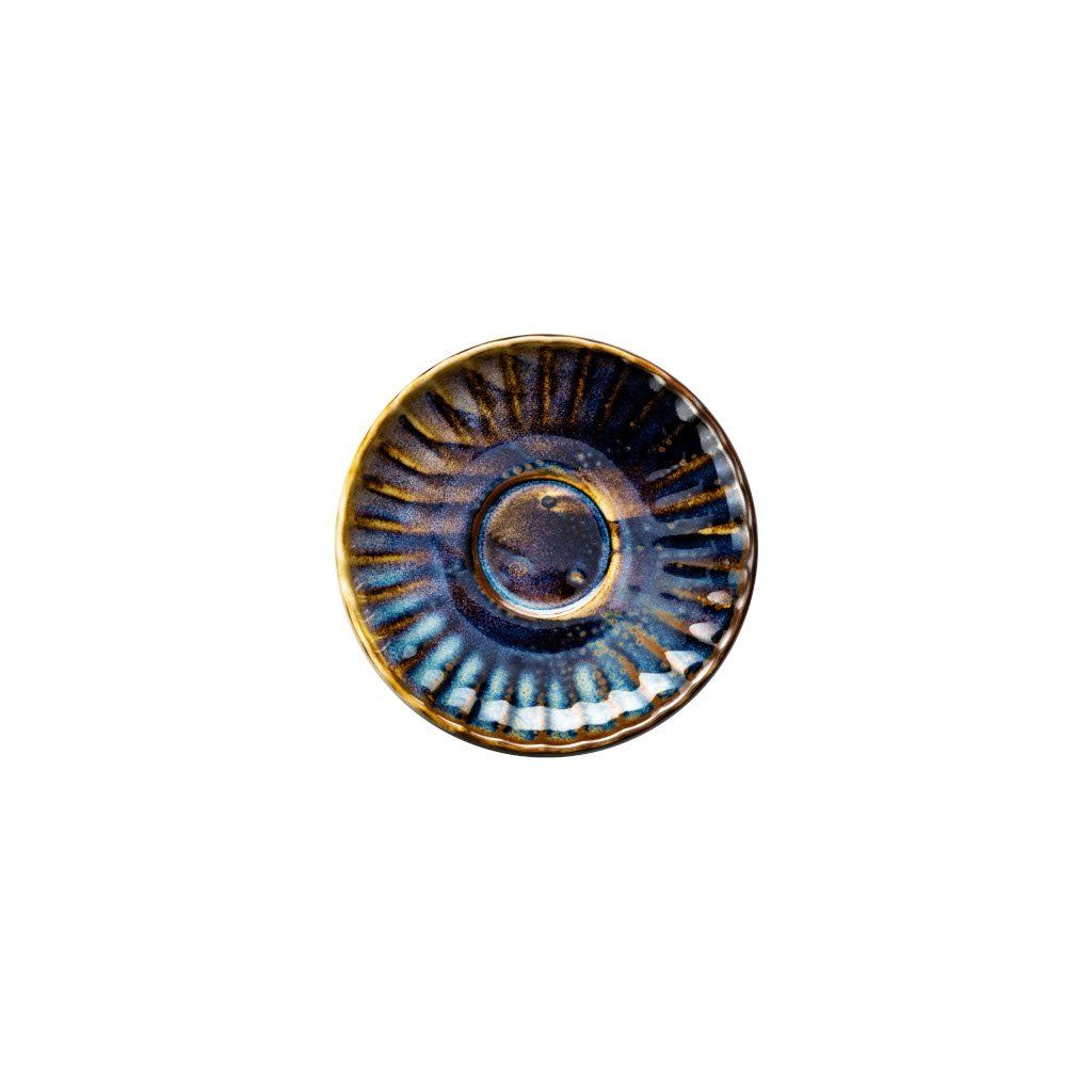 Ultramarínová modř zakončená měděným okrajem ze sebe vyzařuje krásu hlubinného oceánu, kterou spolu s vašimi kulinářskými kousky servíruje přímo na jídelní stoly. 100% porcelán pokrytý glazurou dodává jedinečný vzor získaný během procesu vypalování při 1 380 °C. To také zaručuje velmi vysokou odolnost proti odštípnutí. Zkuste smíchat tuto kolekci s kousky Fire a uvidíte, že vaše nádobí bude vypadat parádně. Měděný okraj dokonale ladí s barvou kolekce Fire. Nebojte se také míchání s řadou Wikle, neboť kobaltově modrá barva s chladnou a něžnou šedou perfektně doplní jakýkoliv dekor. Duo těchto barevných provedení je zárukou originálního uspořádání stolu. A v kombinaci s příbory SU Antic navíc zdůrazní inovativní způsob prezentace nádobí.Podšálek pr. 11,5 cm