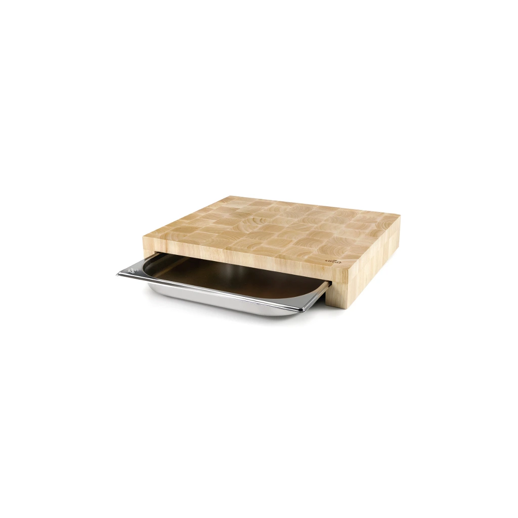 Krájecí deska je praktickým řešením při krájení potravin. Její součástí je i nerezová gastronádoba GN 2/3, do které můžete nakrájené jídlo rovnou přesouvat. Na výrobu desky se používá dřevo z gumovníku, které příjemně pruží, a její povrch je šetrný k ostří nože. Také se příjemně používá, protože při práci nenamáhá zápěstí.Deska krájecí GN 2/3 354 × 325 mm s nádobou