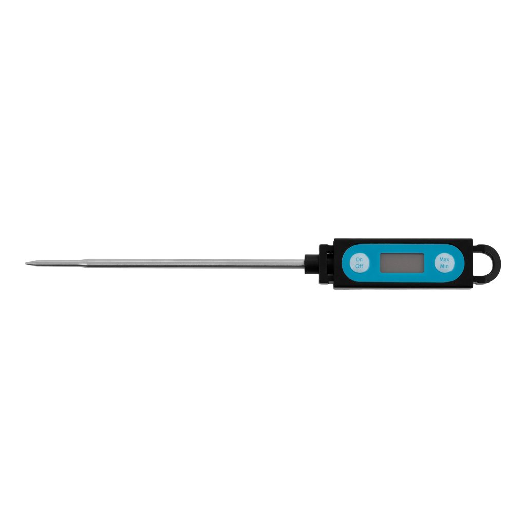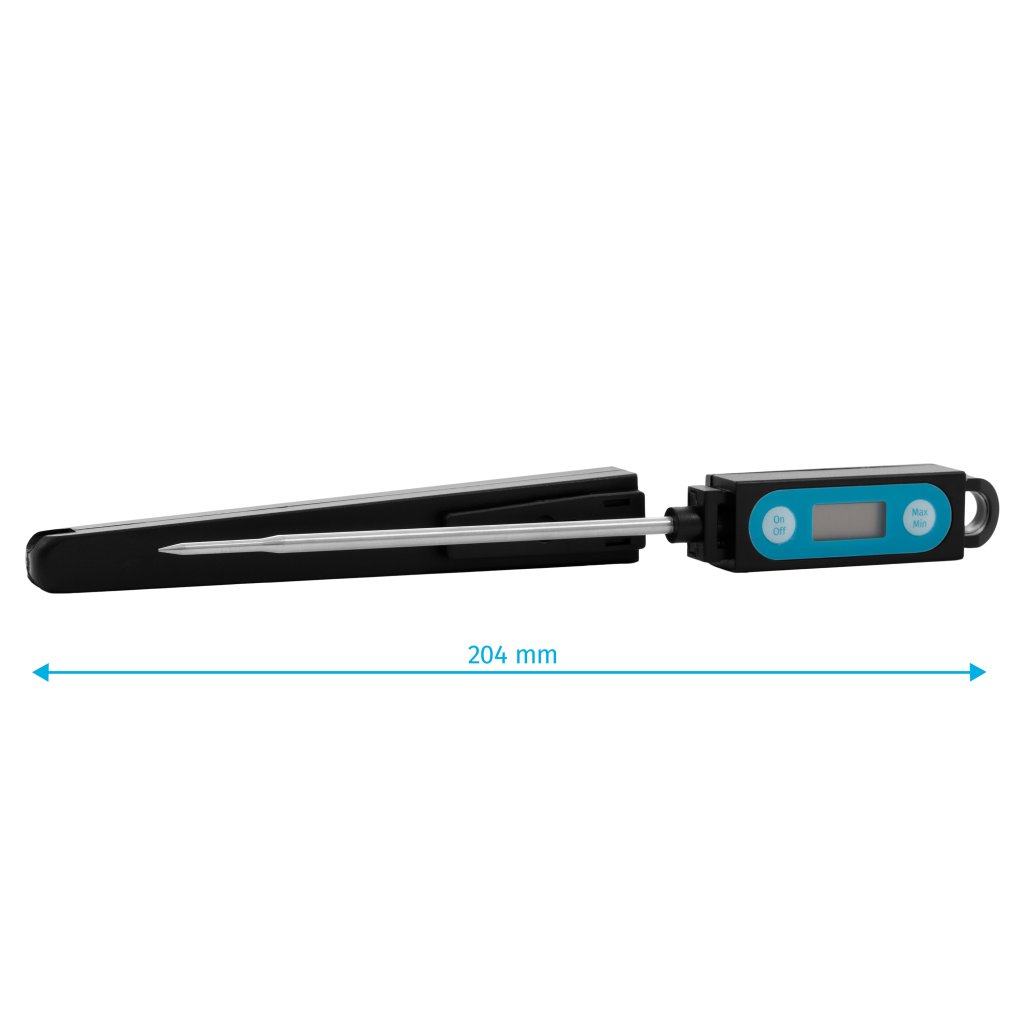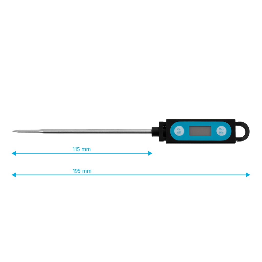 • Univerzální elektrický teploměr pro měření teploty uvnitř masa a dalších potravin. • Teploměr vyrobený z vysoce kvalitního plastu a nerezové oceli zaručuje dlouhé používání. • Preciznost ± 1 °C při teplotách -19,9 ~ 119,9 °C ± 2 °C při teplotách -50 ~ -20 °C a 120 ~ 199,9 °C. • Digitální měřicí přístroj s certifikátem CE, přesný s širokým rozsahem měřené teploty a možností změny °C na F, bude ideálním pomocníkem v každé kuchyni. • Sonda z nerezové oceli (304) o délce 115 mm a průměru 3,8 mm. • Měření teploty během jedné sekundy • Kryt sondy, ergonomická rukojeť z odolného termopolymeru. • Automatické vypnutí teploměru po 45 minutách • Vodotěsný a prachotěsný: IP65 • Baterie jsou součástí dodávky (LR44/AG13)Provoz:Zvolte jednotku měření kliknutím na příslušné tlačítko (°C nebo °F).Měření teploty:Zasuňte sondu přibližně 25 mm do výrobku nebo ji ponořte do kapaliny a po stabilizaci teploty ji odečtěte na displeji LCD.Důležité informace: 1. Chcete-li vymazat historii měření, stiskněte a podržte tlačítko MAX/MIN po dobu 3 sekund. Před novým měřením vždy vymažte historii měření, aby byly naměřené hodnoty přesné. 2. Před novým měřením vždy očistěte sondu, aby nedošlo ke kontaminaci následujících výrobků. 3. Po výměně baterií se ujistěte, že je bezpečnostní klapka pevně dotažena, aby se zabránilo vlhkosti a nečistotám uvnitř přístroje. 4. Když začne displej LCD slábnout, okamžitě vyměňte baterii za novou. 5. Teploměr nikdy nepoužívejte při nepříznivých teplotách (nižších než 0 °C nebo vyšších než 50 °C) - mohlo by dojít k chybným údajům nebo poškození přístroje.Doplňkové parametry