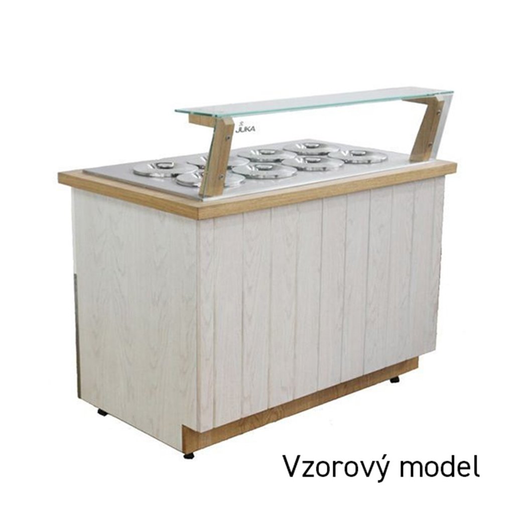 statické chlazení, maximální teplota okolí +30 °C a vlhkost 55 %, nerezová vrchní deska, skleněná nástavba, válcové gastronádoby s víkem - ⌀ 20 cm (objem nádoby - 7,3 l), možnost individuálního opláštění, zařízení vhodné k zabudováníDoplňkové parametry