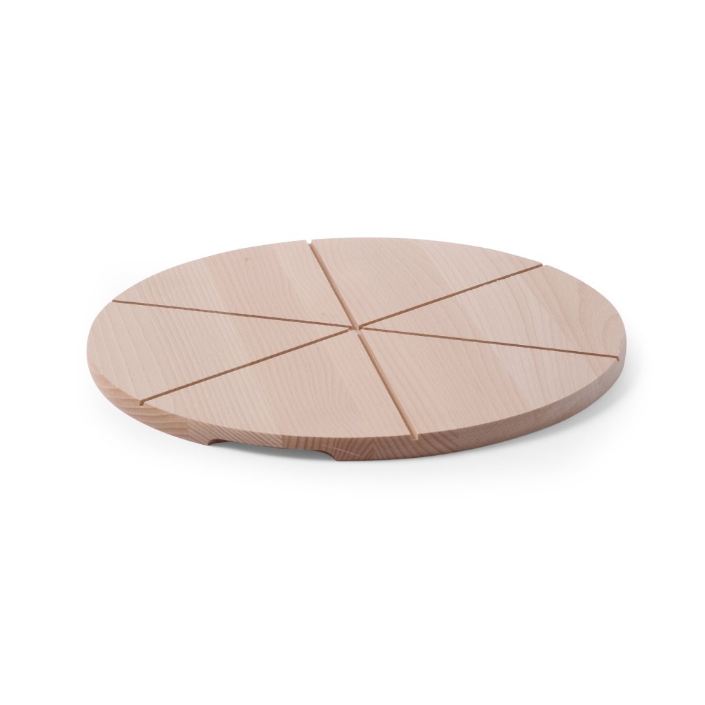 Dřevěný talíř pod pizzu vyrobený z bukového dřeva. Prohloubení umožňuje krájení pizzy na 6 rovných části. Nelze mýt v myčkách.Doplňkové parametry