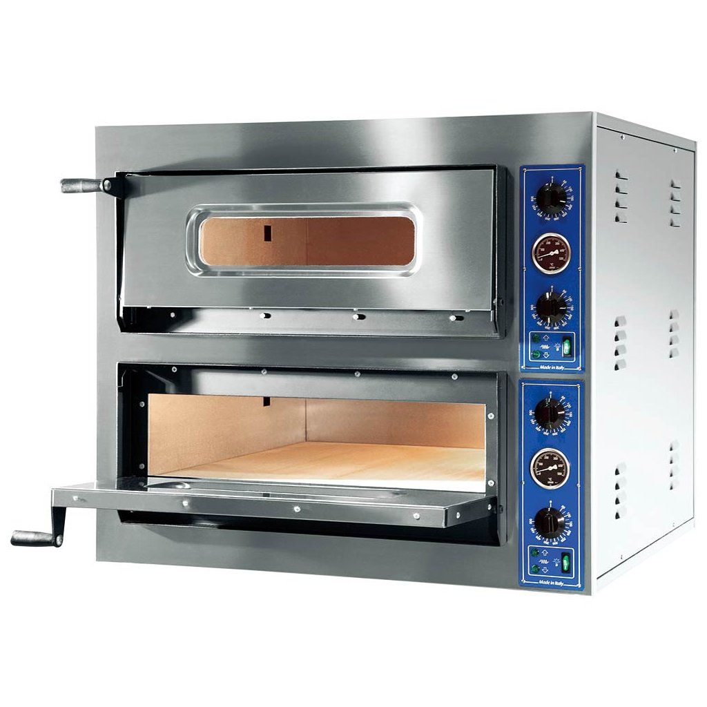 Dvoukomorová pizza pec, 2x4 pizza 360 mm:• přední panel z nerezové oceli• plášť z černě lakované oceli• šamotové desky• teplotní pracovní rozsah do 500°C• osvětlení komory• komín odvádějící páru• možnost nezávisléno ovládání horním a dolním topným tělesemDoplňkové parametry