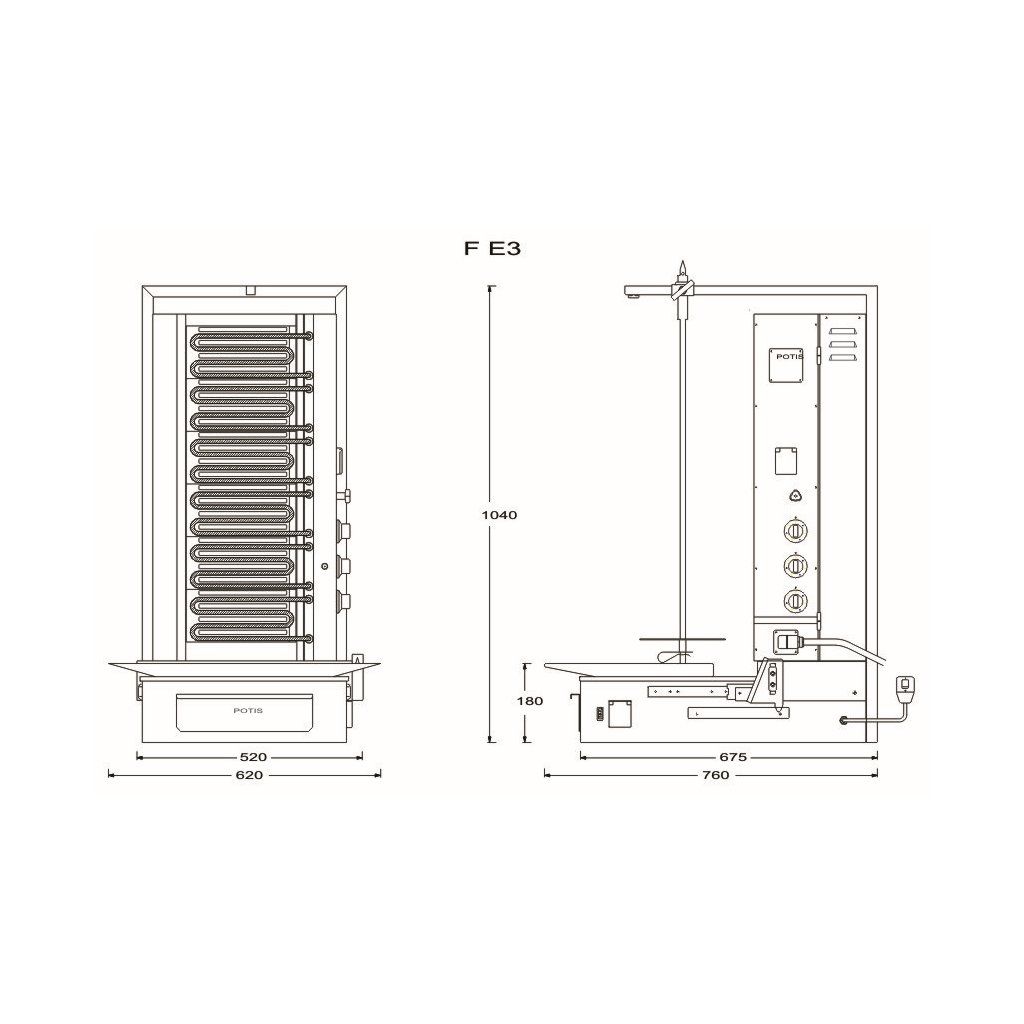 Elektrický gril na kebab/gyros, 3 topná pole, zátěž 50 kg, 400V, 7,8 kW, dolní pohon 11,5 W, 760x620x1040 mm | POTIS, F E3-N