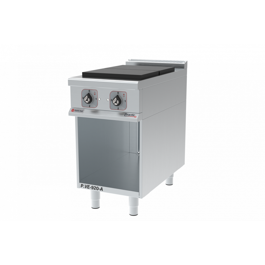 Elektrický vařič se základnou P.VE-920-A Produktová řada a konstrukce Model P.VE-920-A se skládá z: Horní část: vařič vybavený dvěma výkonnými elektrickými varnými deskami 2×3 kW, rozměry jedné desky jsou 415 × 294 mm Spodní část: může sloužit jako úložný prostor s dvířky a policemi – dle požadavků zákazníka