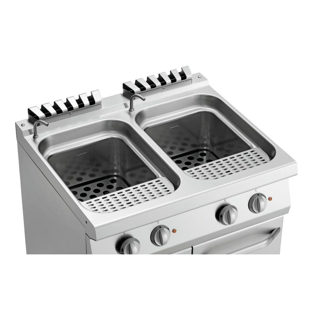 Elektrický vařič těstovin, volně stojící, 2x24 l:- Š 800 x H 700 x V 850-900 mm- příkon: 14 kW / 400 V 50 Hz 3 NAC- kapacita: 2 x 24 litrů- integrovaný ventil přívodu a odvodu vody- hmotnost: 74 kg- prodává se bez košůDoplňkové parametry