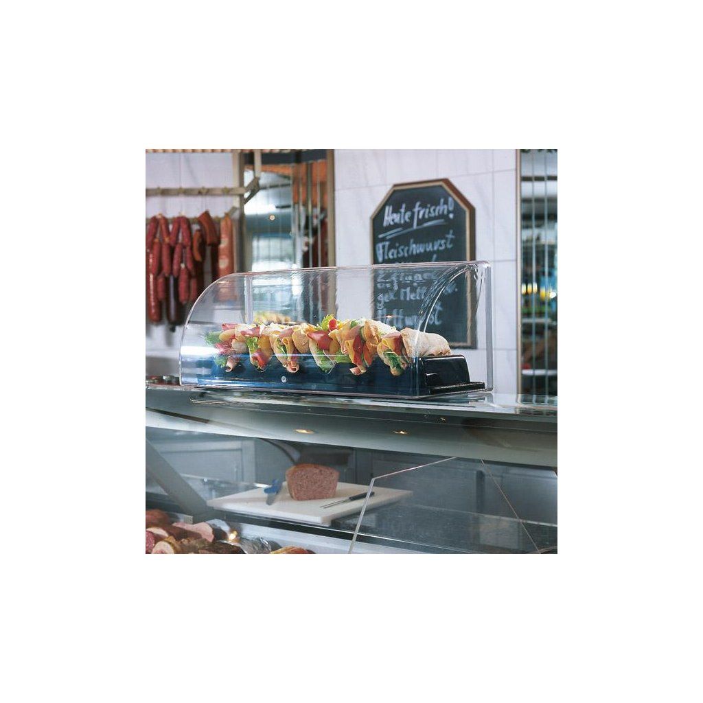 Univerzální vitrína monoblock, vyrobená z průhledného materiálu. Protiskluzový podstavec. Vhodné do bufetů, kantýn, cukráren...