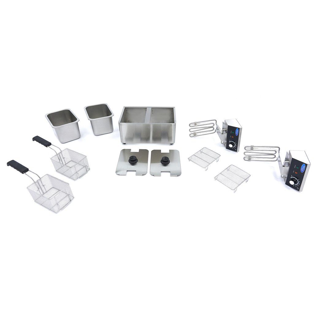 Kvalitní fritéza je v profesionální kuchyni nepostradatelná. Velkou výhodou této dvojité fritézy je, že se jedná o kompaktní model, který snadno umístíte na pracovní desku nebo stůl. Při práci s horkým olejem je samozřejmě klíčová bezpečnost, proto je tato fritéza vybavena dvěma odnímatelnými víky, která zabraňují rozstřiku oleje. Rukojeť je také žáruvzdorná, což vám umožní bezpečnou práci, a pro větší stabilitu je fritéza vybavena gumovými nožičkami. Aby fritovací olej vydržel co nejdéle čerstvý, pracuje tato fritéza se studenou zónou. Topné těleso je zavěšeno přibližně 2 cm nad dnem. To znamená, že olej pod topným tělesem zůstává chladnější a drobky se hůře připalují. Díky tomu vydrží fritovací olej déle a je třeba jej méně často vyměňovat.