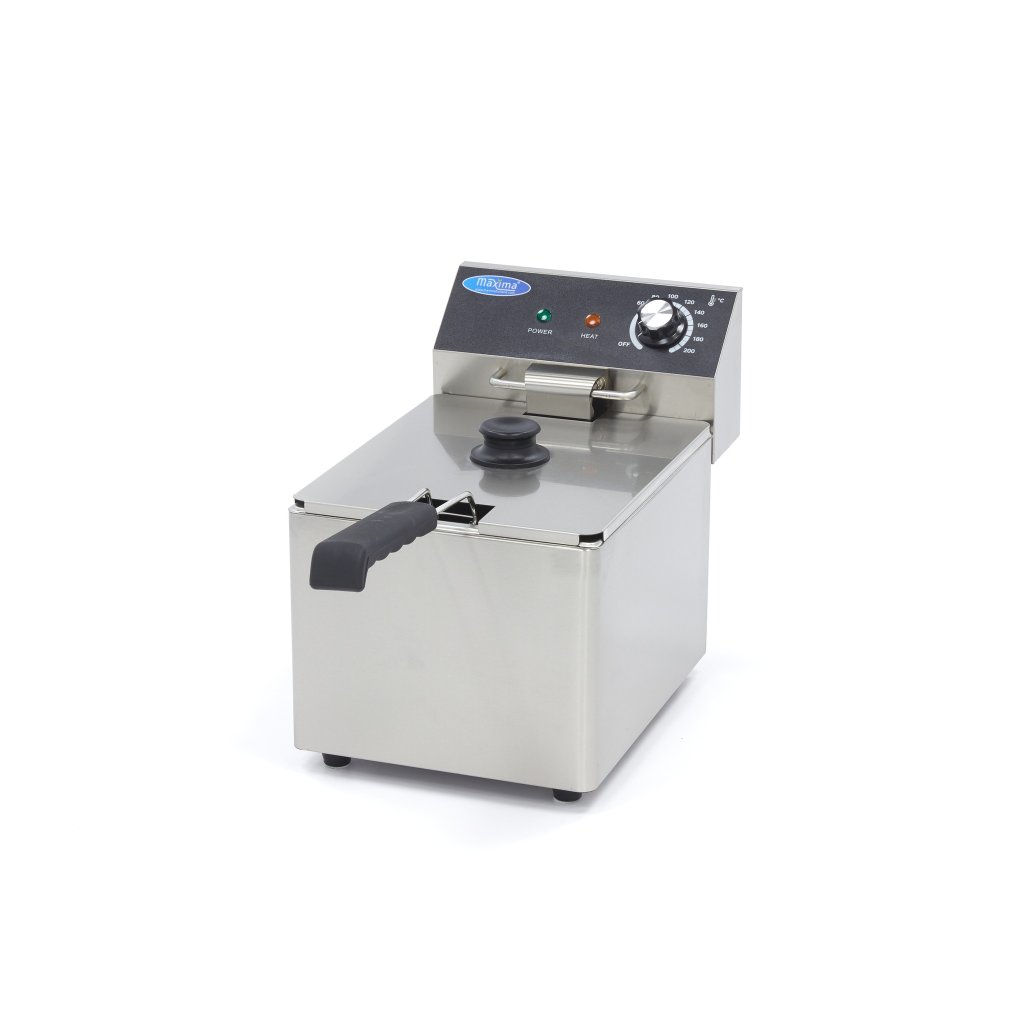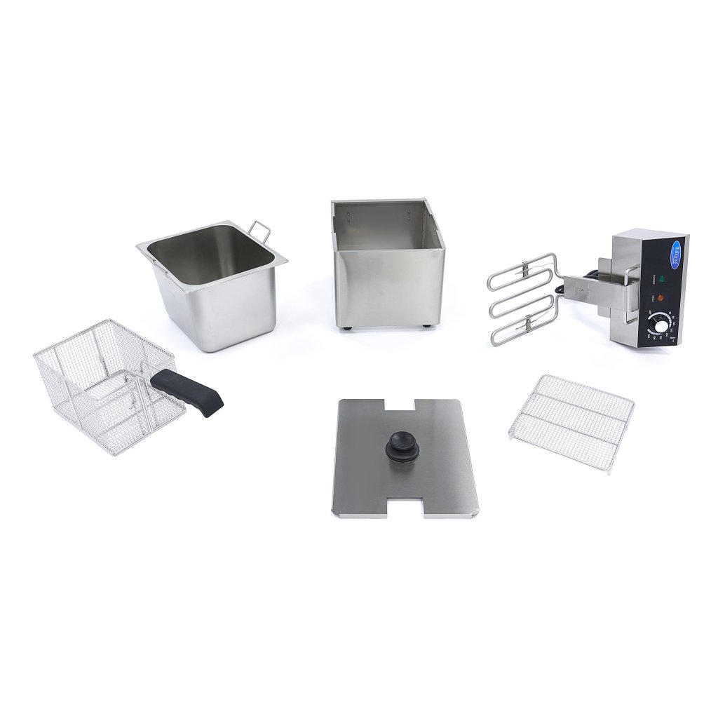Tato profesionální fritéza má odnímatelné víko, které zabraňuje rozstřikování oleje během fritování. Rukojeti víka a koše jsou tepelně odolné pro bezpečnou a příjemnou práci. Díky gumovým nožičkám zůstává fritéza pevně na svém místě. Kompaktní stolní model je přínosem v každé kuchyni, protože jej můžete umístit na jakoukoli pracovní plochu nebo stůl. Studená zóna ve spodní části fritézy zajišťuje, že olej je třeba vyměňovat méně často. Topné těleso je umístěno těsně nad dnem fritézy, takže se olej pod ním tolik nezahřívá. Drobky, které spadnou na dno, se méně rychle spálí, což znamená, že olej zůstane déle čerstvý.