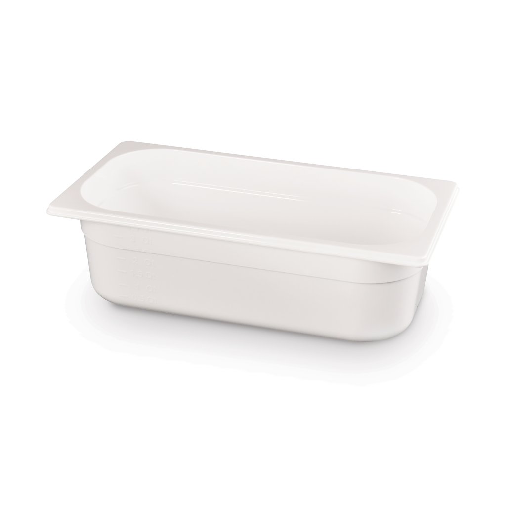 Vysoké kvality gastronádoba GN vyrobená z bílého polykarbonátu. Nepohlcují zápachy a chutě. Termický odpor -40 °C do 110 °C. Lze mýt v myčkách.Doplňkové parametry
