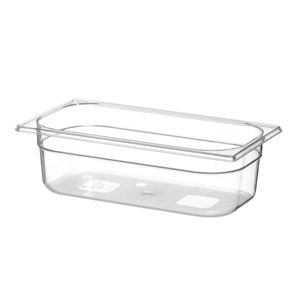 Profesionální gastronádoby GN vyrobené z průhledného polykarbonátu. Nepohlcují pachy ani chutě. Vhodné k použití v mikrovlnkách. Lze mýt v myčkách. Stohovatelné. Na gastronádobě je měrka.Doplňkové parametry
