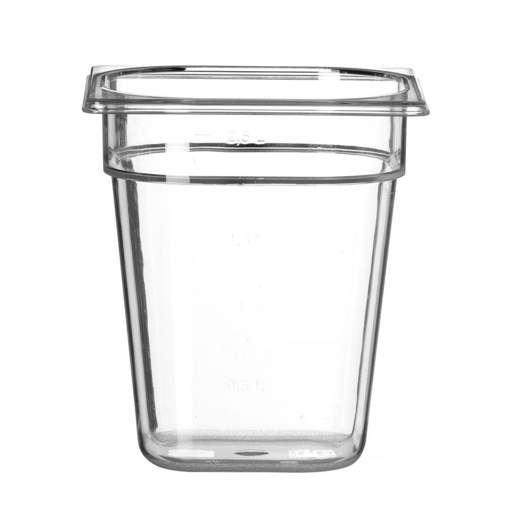 Profesionální gastronádoby GN vyrobené z průhledného polykarbonátu. Nepohlcují pachy ani chutě. Vhodné k použití v mikrovlnkách. Lze mýt v myčkách. Stohovatelné. Na gastronádobě je měrka.Doplňkové parametry
