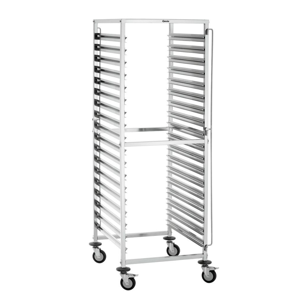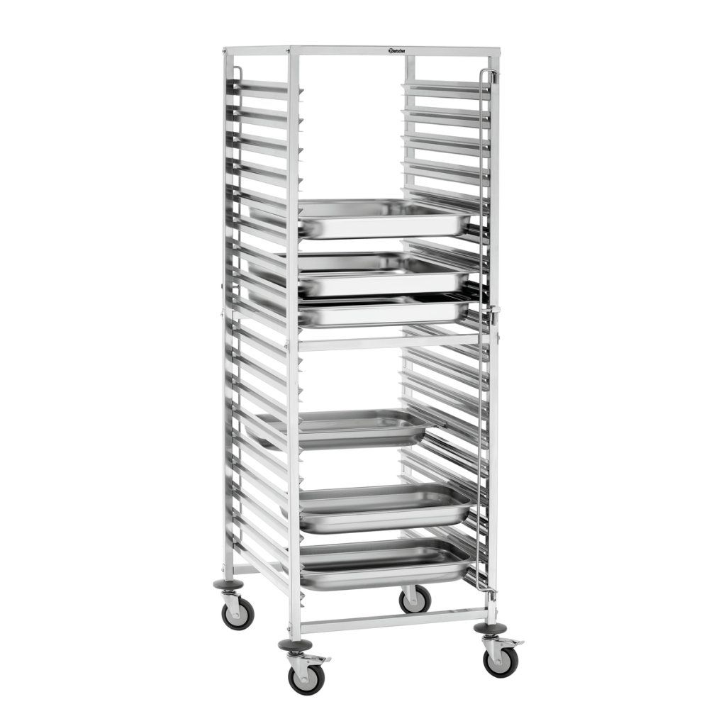 Gastronomický vozík umožňuje bezpečný transport GN nádob, roštů a plechů až do velikosti 2/1 GN na 18 párech vodicích lišt. Oboustranné zajištění účinně brání posunu uložených nádob a zvyšuje bezpečnost při manipulaci v kuchyni, pekárně i výdejních zónách.