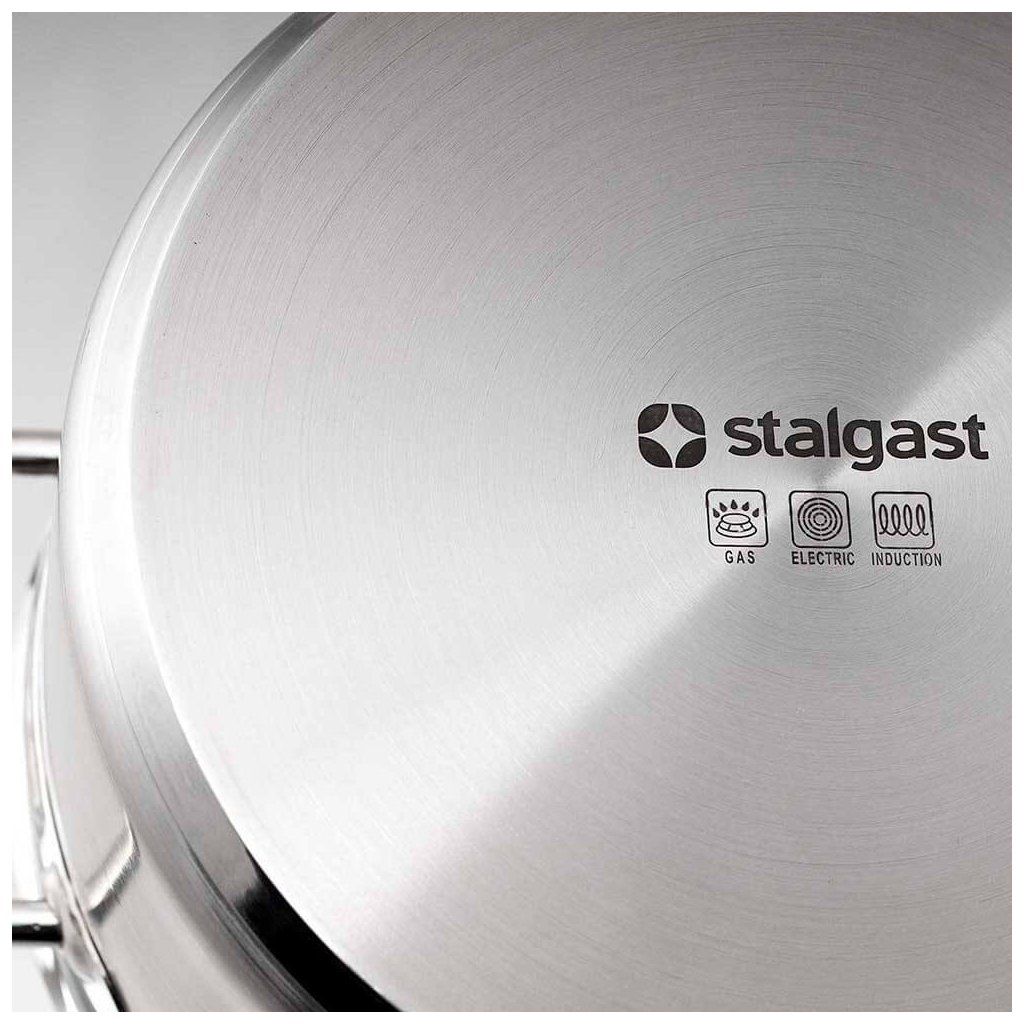 Hrnec z nerezové oceli se saténovým povrchem, výrobce STALGAST. Má nenahřívající se vícebodově svařované úchyty, trojité dno, které zajišťuje odolnost proti korozi, poskytuje dobrou tepelnou vodivost. Vhodný pro všechny typy sporáků včetně indukčních. Lze mýt v myčce. S poklicí.Doplňkové parametry