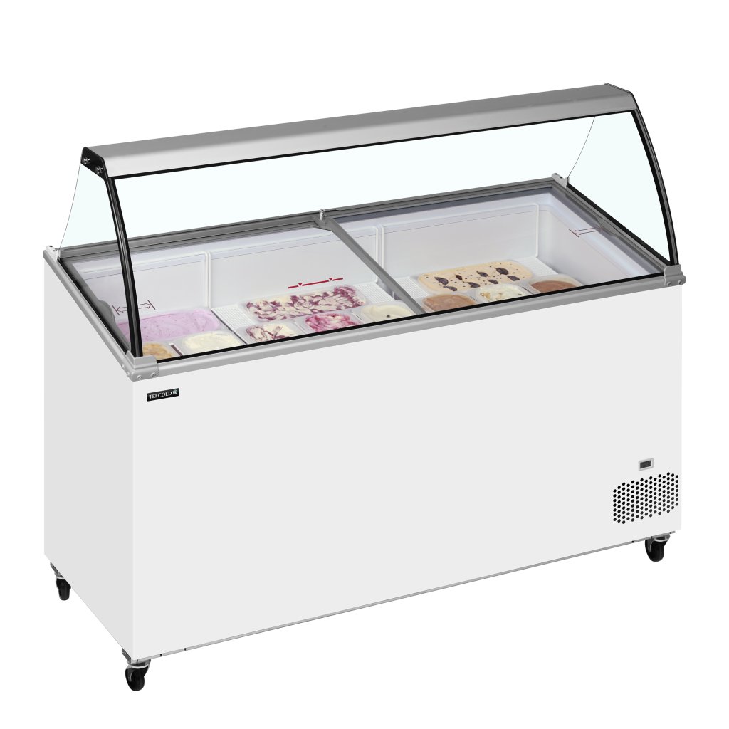 Distributor kopečkové zmrzliny Řada distributorů zmrzliny IC SC SO nabízí skvělou kvalitu za výhodnou cenu. Tyto distributory mají rovná posuvná víka, která chrání prostor se zmrzlinou před únikem chladu, která jsou navíc opatřena zámkem. Ochraný kryt má oblíbený oblý tvar a díky svému jednoduchému designu je distributor ideální pro reklamní polep. Všechny modely této řady jsou optimalizovány pro koše, které pojmou 5l vaničky na zmrzlinu. Koše nejsou součástí, typ a počet je nutné objednat zvlášť. Distributor zmrzliny se skládá ze dvou částí (mraznička + skleněná nástavba), které se mohou na faktuře objevit jako samostatné položky.Doplňkové parametry