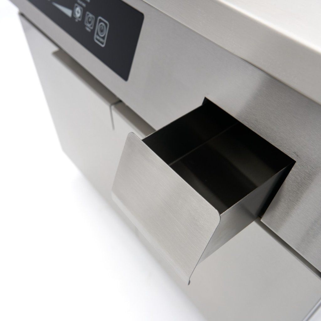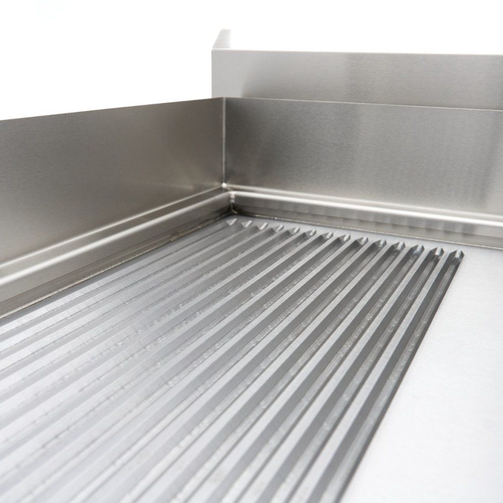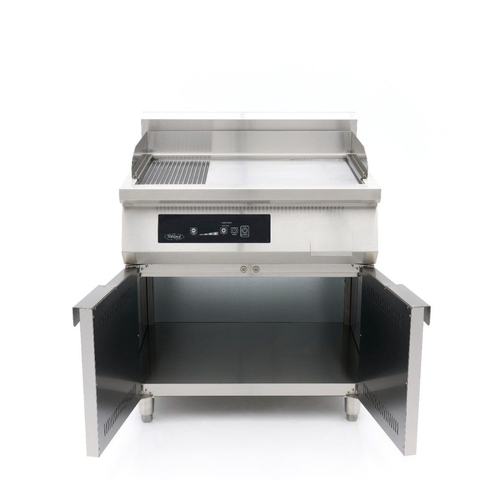 Díky chytrému designu lze tuto profesionální indukční pánev s podstavcem použít pro více způsobů přípravy pokrmů. Vroubkovaný povrch využijete pro dokonalé grilovací stopy na mase, rybách nebo zelenině a hladký povrch pro vejce, palačinky nebo jemné mořské plody. Odkapávací miska shromažďuje olej a zabraňuje jeho hromadění, zatímco podstavec z nerezové oceli zajišťuje stabilní umístění, dobrou ventilaci a další úložný prostor pod deskou.
