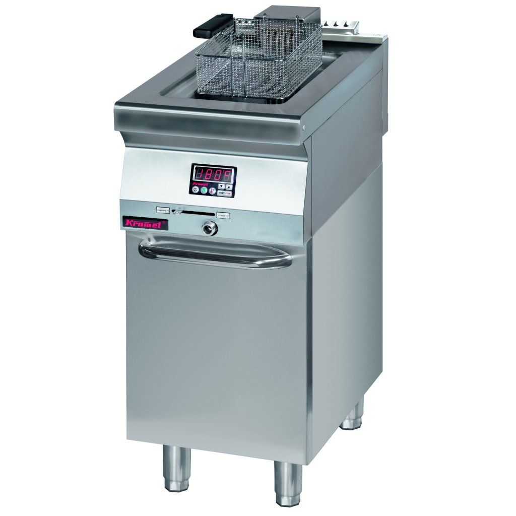 Jednokomorová elektrická fritéza 1x 8 l s vypouštěcím kohoutem a elektronickým ovládáním, na uzavřeném podstavci s dvířky, 8 kW, 400 V, 400x700x900 mm | KROMET, 700.FE-10f.S.D