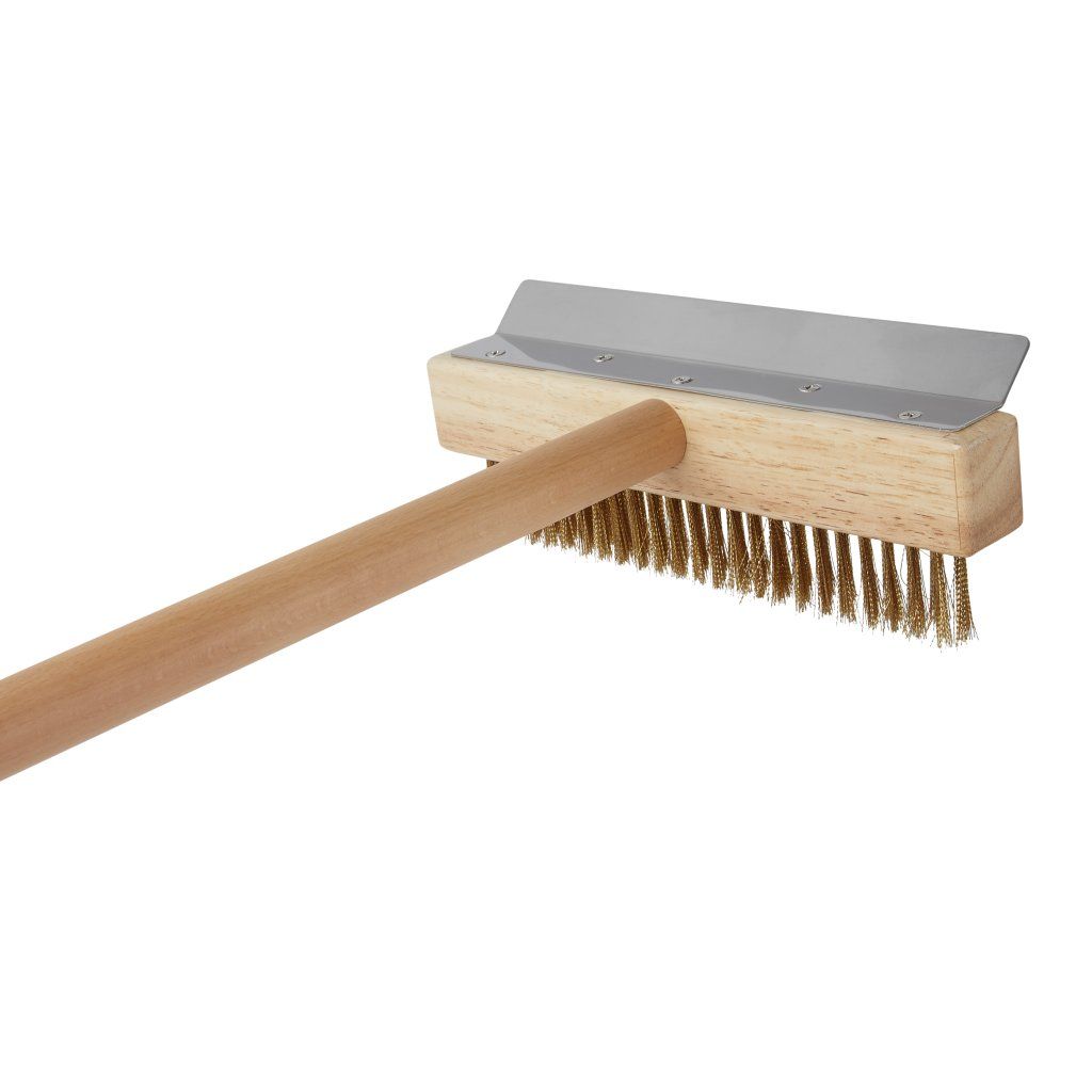 Kartáč na čištění pecí na pizzu s vlasem z mosazi a dřevěným úchytem.