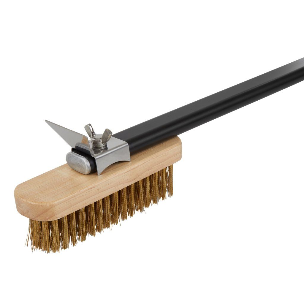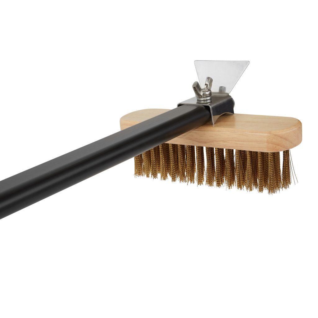 Kartáč na čištění pecí na pizzu s vlasem z mosazi a hliníkovým úchytem.