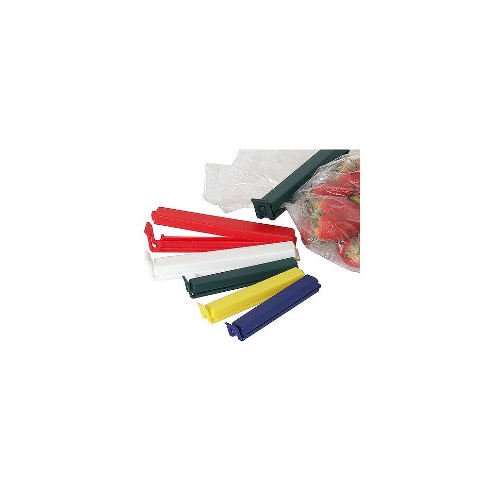Plastové klipy na sáčky, délka 140 mm. Možnost použití v mrazničce i mikrovlnné troubě. Barvy HACCP: červená, modrá, žlutá, zelená, bílá (4 kusy každé barvy).Doplňkové parametry