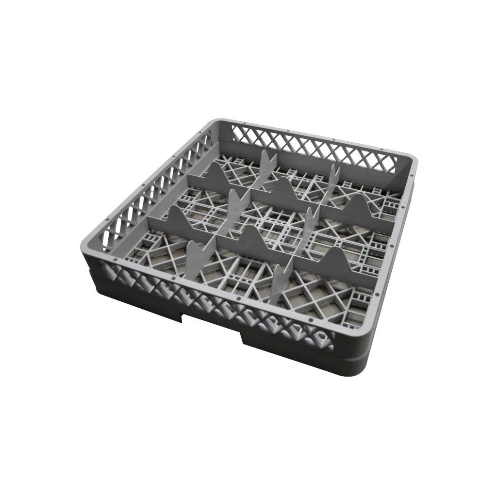 Umývejte, přepravujte a skladujte sklenice v koši, který eliminuje potřebu opětovného umývání. Otevřené vnitřní přehrádky umožňují důkladnou cirkulaci vody i rychlé sušení, zatímco vnější stěny udržují nečistoty venku. Tyto unikátní uzavřené stěny také snižují riziko poškození nebo úrazu při zvedání a přesouvání za pomocí tvarovaných rukojetí.Koš do myčky 9 pozic 50 × 50 × 10 cm, Ø sklenic 14,9 cm