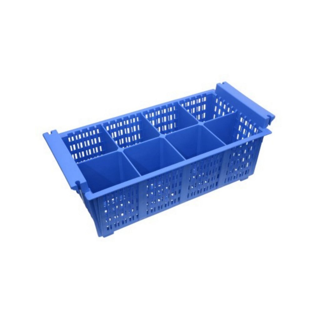 Umývejte, přepravujte a skladujte příbory v koši, který eliminuje potřebu opětovného umývání. Vnější stěny udržují nečistoty venku a také snižují riziko poškození nebo úrazu při zvedání a přesouvání za pomocí tvarovaných rukojetí.
