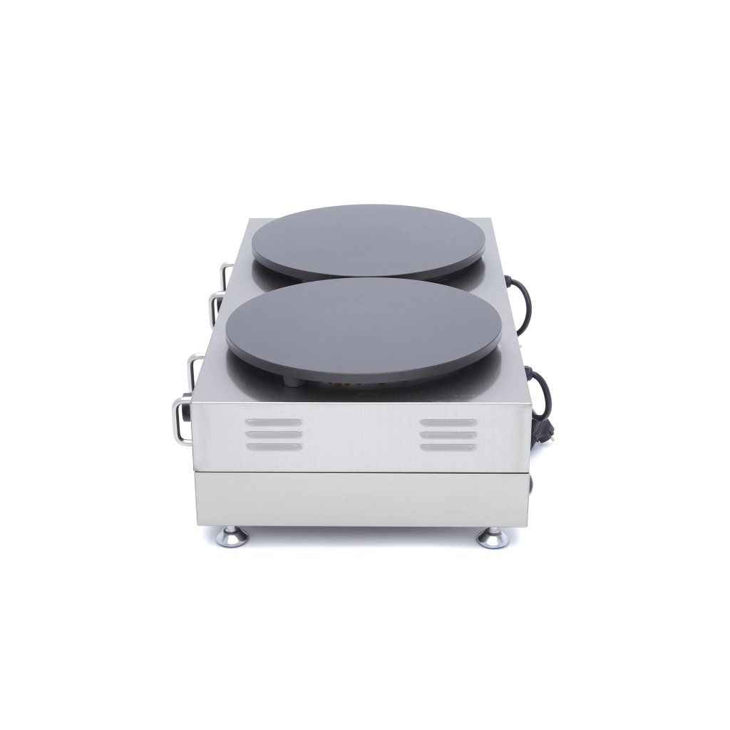 Na tomto dvojitém elektrickém palačinkovači můžete připravit ty nejchutnější palačinky, tenké francouzské lívance. Čerstvé domácí palačinky jsou ideální k snídani, obědu, dezertu nebo jako snadná svačina. Kompaktní rozměry zajišťují, že palačinkovač můžete používat nejen ve své kuchyni pro catering, ale také ve stánku s koláči, v potravinářském voze nebo ve stánku na trhu během akcí. Pod plechem na pečení palačinek se nachází úložná zásuvka, kde můžete připravené palačinky uchovávat. Pečicí plech má optimální přenos tepla pro rychlou výrobu velkých porcí palačinek.